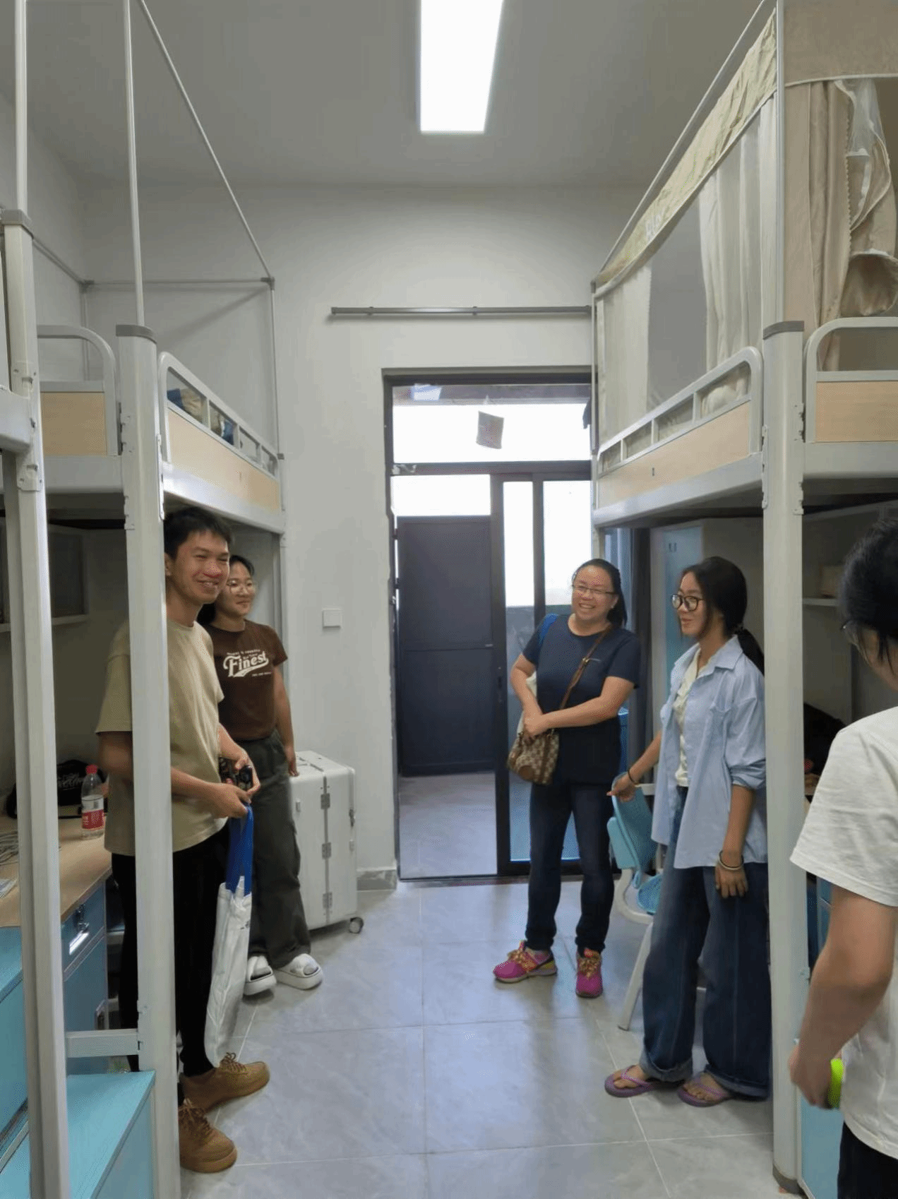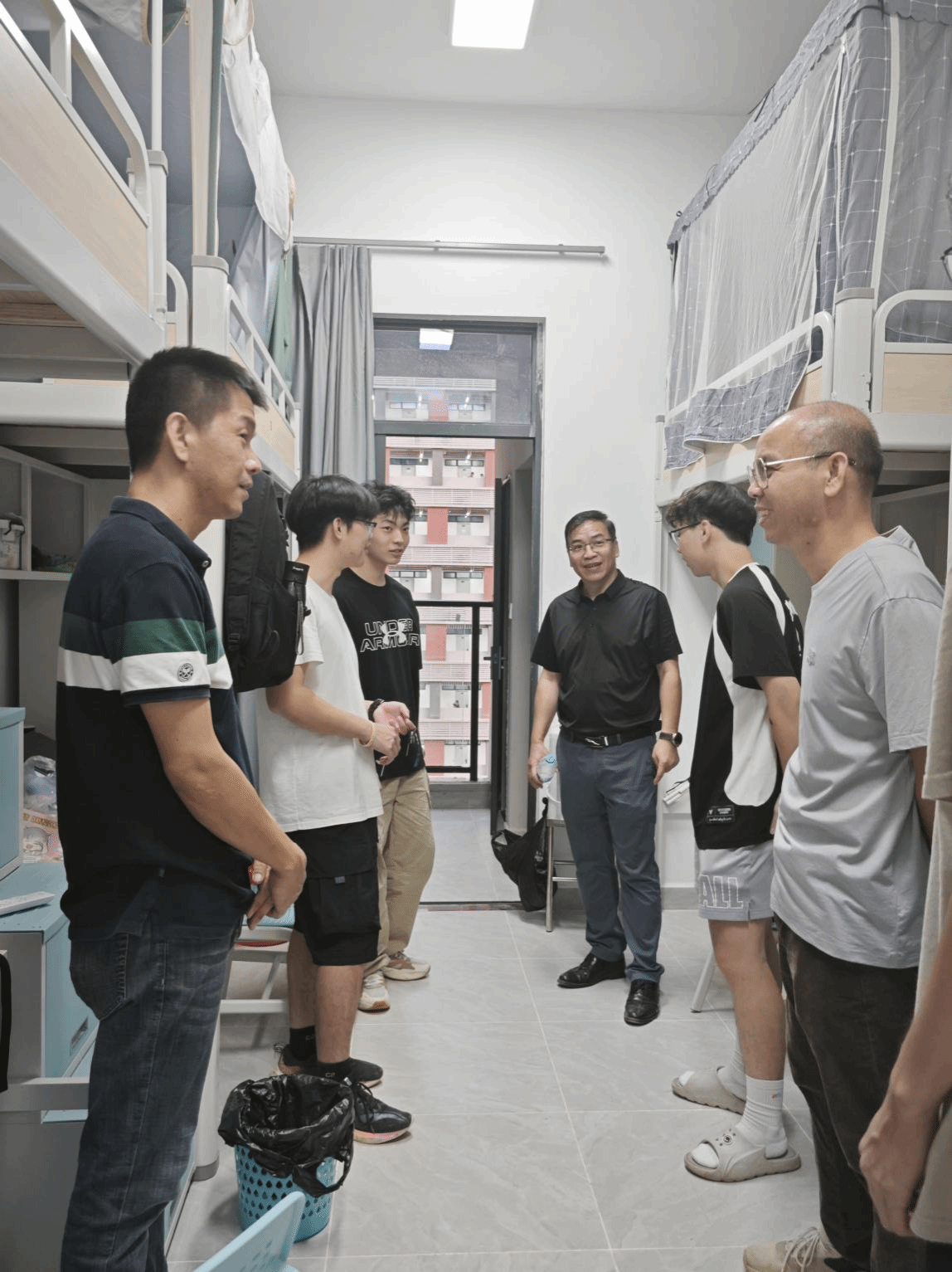 为了深入了解同学们的入学情况和生活情况,引领新生们更快地投入新的环境。10月8日新生报到当晚,学院党委书记莫琼玉、院长弓满锋、副书记黄展、副院长田学军、副院长苏财茂在系主任、学院辅导员、新生班主任以及助理班主任的陪同下,前往2024级新生所在的湖光校区A区、B区宿舍进行走访慰问,向新生们致以热情的欢迎和亲切的问候。