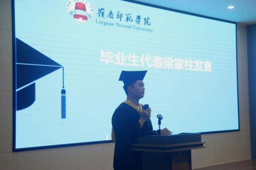 2019级工业设计专业梁家柱同学作为毕业生代表发言。他回顾了自己入伍经历和退伍复学后的大学生活,表达了对学校和学院的不舍和对老师谆谆教导的感激,以及对未来的憧憬和展望,同时他祝愿学校和学院继续磅礴发展,祝福同学们毕业快乐,祝愿师弟师妹们成长成才。