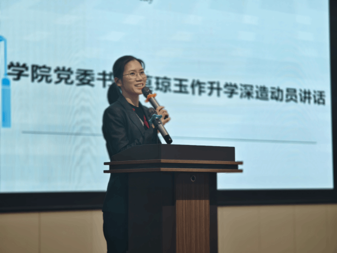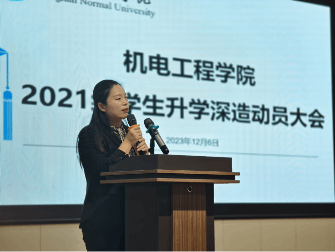 莫琼玉作动员讲话。她从个人需要、社会需求、民族复兴三个方面向同学们展示升学深造的重大意义,希望机电的莘莘学子可以勇于挑战自己,不负韶华,努力在自己的学业规划和学习深造上画出最浓重的一笔。她还表示学院将会从完善机制、全面育人、精准帮扶三个维度给予考研的学子们最大的鼓励与支持。最后,她提出了三点建议,即坚定信心、合理规划、持之以恒,她衷心祝愿2021级的学子们可以在未来的一年里披荆斩棘,乘风破浪。