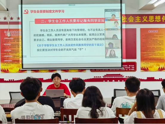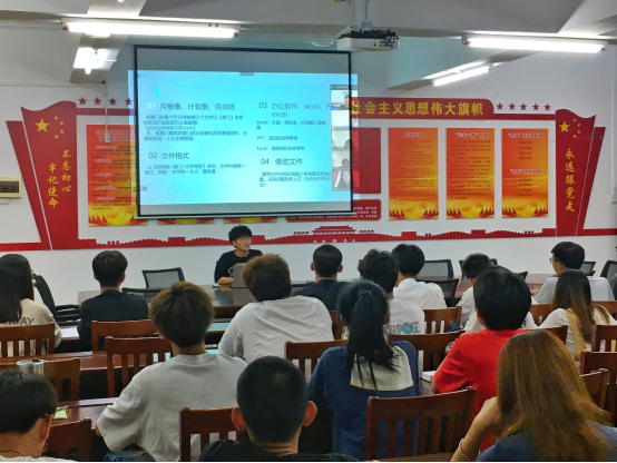 培训内容分为会议类、文件类和活动类三个板块。学生会办公室主要负责人刘桂松在会议上向新职工作人员介绍了学生会内部系统会议的工作要求,对工作文件基础格式、办公软件使用规定、各活动工作流程以及注意事项等进行了详细的讲解。