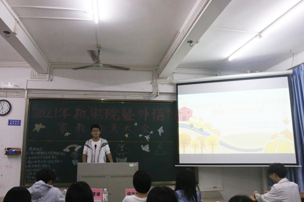 11月13日晚,机电工程学院联合外国语学院于我校弘雷楼703教室召开家教动员大会,旨在让21级新生深入了解家教。本次会议由机电院勤工助学中心学生干部陈李浩和梁洁芷主持。