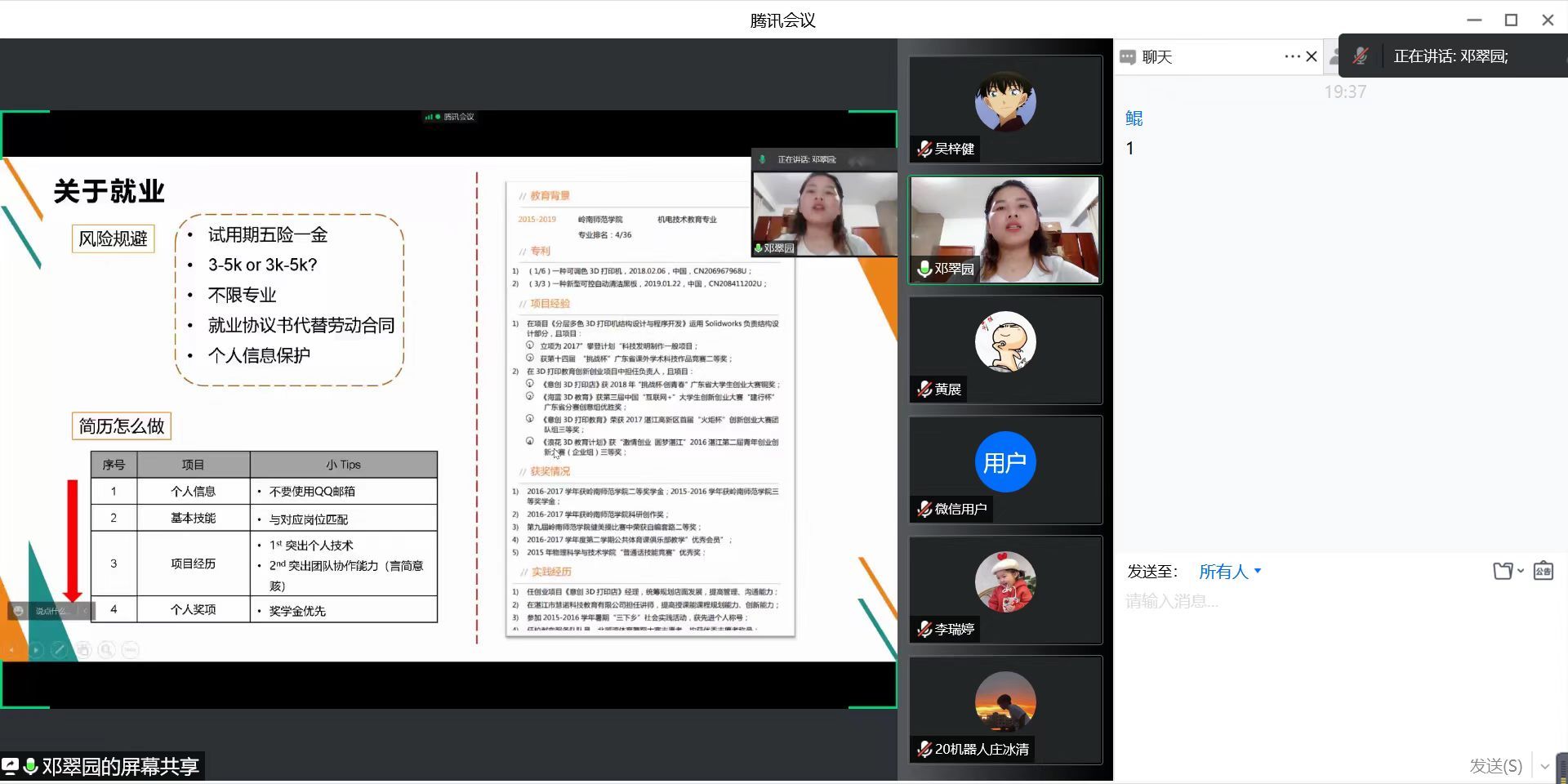 11月29日晚,机电工程学院在腾讯会议线上举办了校友大讲堂活动。活动邀请到了2015届机电技术教育专业毕业的优秀校友、现就职于华为技术有限公司的邓翠园作 就业指导的专题讲座。学院党委副书记黄展,辅导员吴梓健,2020级和2021级学生参加了本次报告会。