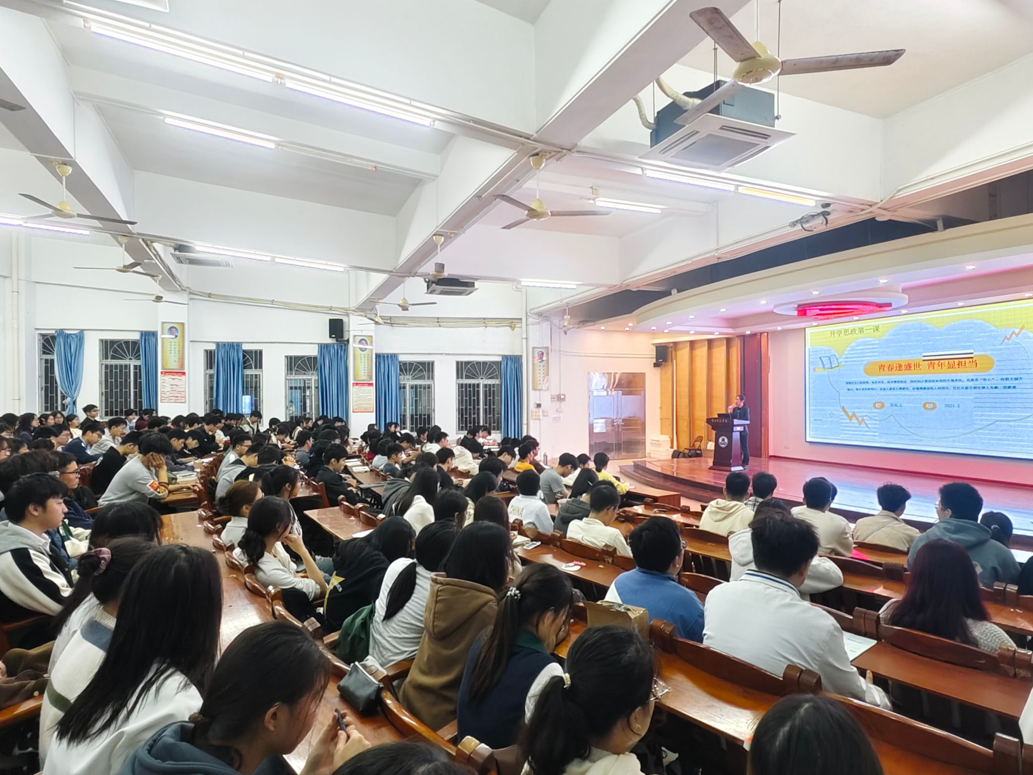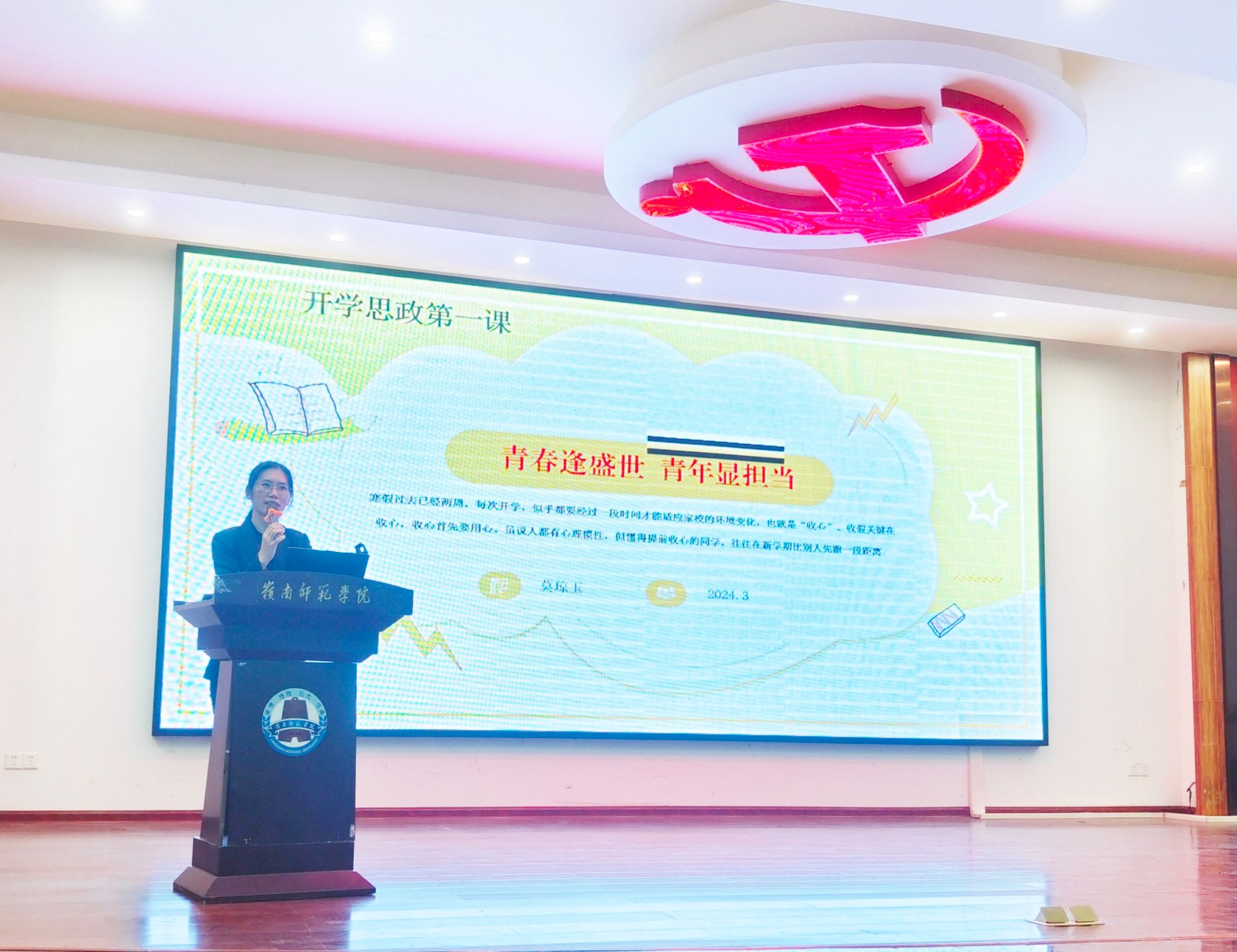 3月13日晚,机电工程学院党委书记莫琼玉在第三教学楼211教室为学院全体学生干部讲授主题为“青春逢盛世,青年显担当”的“思政第一课”,结合学校教学审核评估的迎评工作,引导干部们要勤学苦练、增长才干,树立榜样、担当有为,让勤奋学习成为扬帆远航的动力,让增长本领成为青春搏击的能量,不负青春、不负时代。