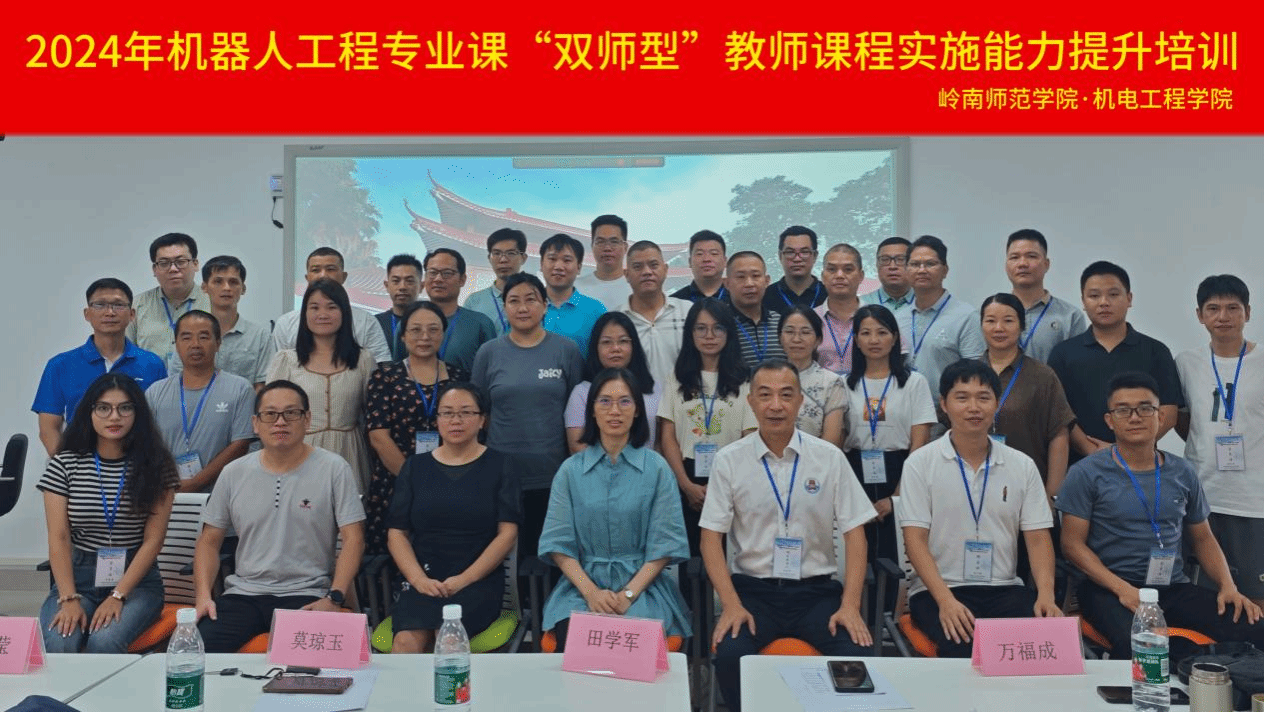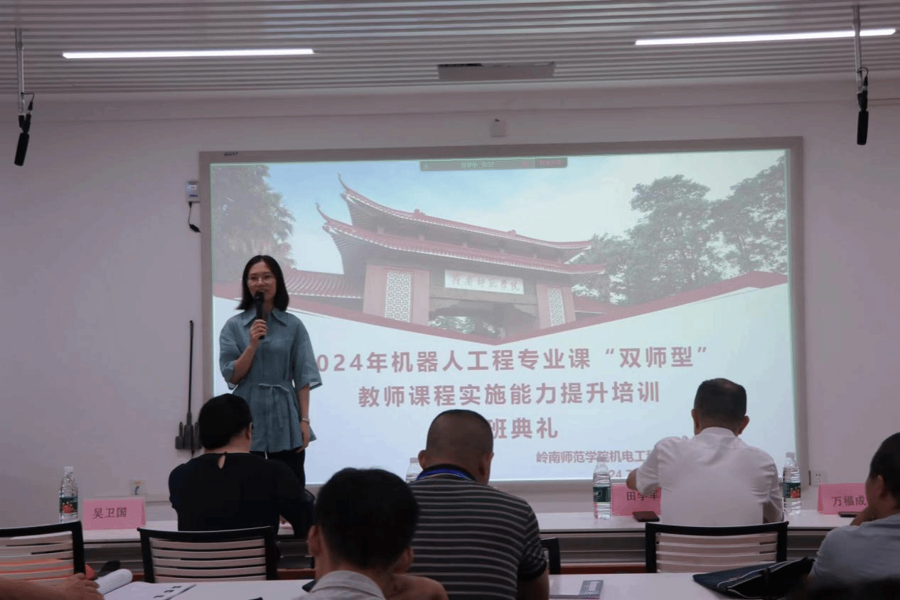 2024年7月23日上午,由岭南师范学院机电工程学院承办的广东省2024年机器人工程专业课“双师型”教师课程实施能力提升培训开班典礼在岭南师范学院第五教学楼A栋614培训教室顺利举行。岭南师范学院机电工程学院党委书记莫琼玉、项目负责人田学军副院长(教授)、工业设计系主任万福成副教授、机器人工程系主任吕莹副教授、班主任吴卫国老师等出席开班典礼。开班典礼由班主任吴卫国老师主持。