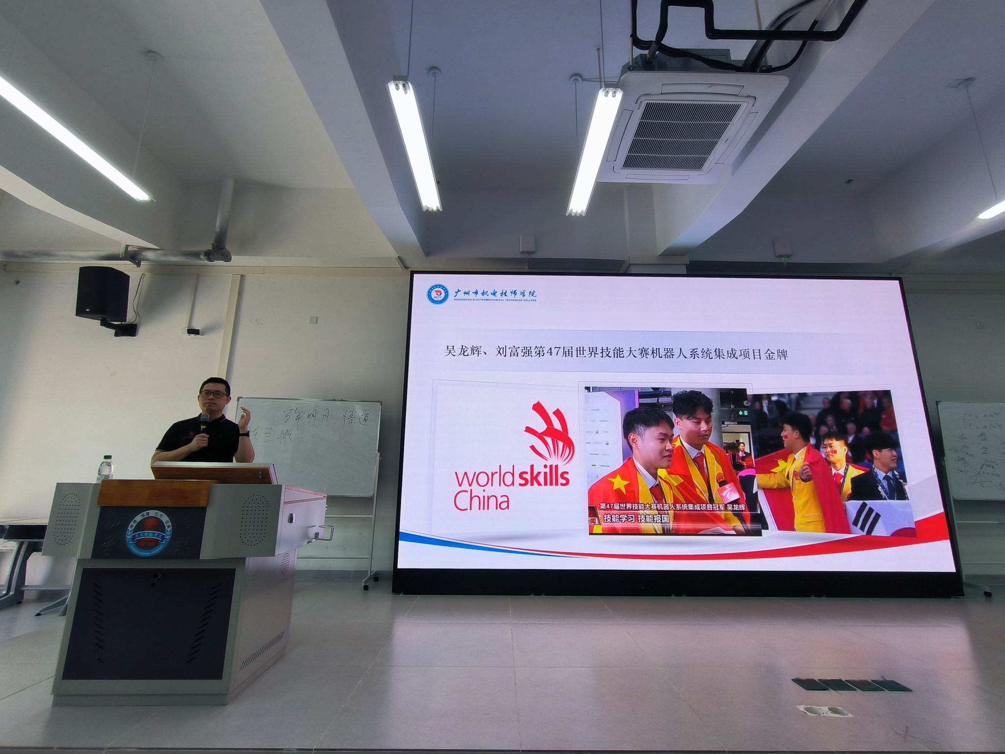 报告会上,张善燕校友以时间为线索,从“初入大学:迷茫与探索”、“大胆尝试:新领域的挑战”、“不断学习:技能提升之路”和“职业启航:跟岗实习的经历”以及“持续进步:职业规划与调整”等五个方面,与同学们分享了自己的成长轨迹与奋斗经历,讲述了自身对职业教育的理解,阐述了职业教育的要义,为师弟师妹提供了宝贵的建议与意见。他勉励大家要珍视青春岁月,带着问题去学习,独立思考、刻苦钻研、大胆操作,珍惜每次学习的机会,并且提升个人的综合素养与创新能力。最后,他向同学们详细介绍了世界技能大赛的发展史、办赛理念、举办机制、竞赛规则,也分享了自己带队参加第47届世界技能大赛并指导学生获得金牌的参赛历程。