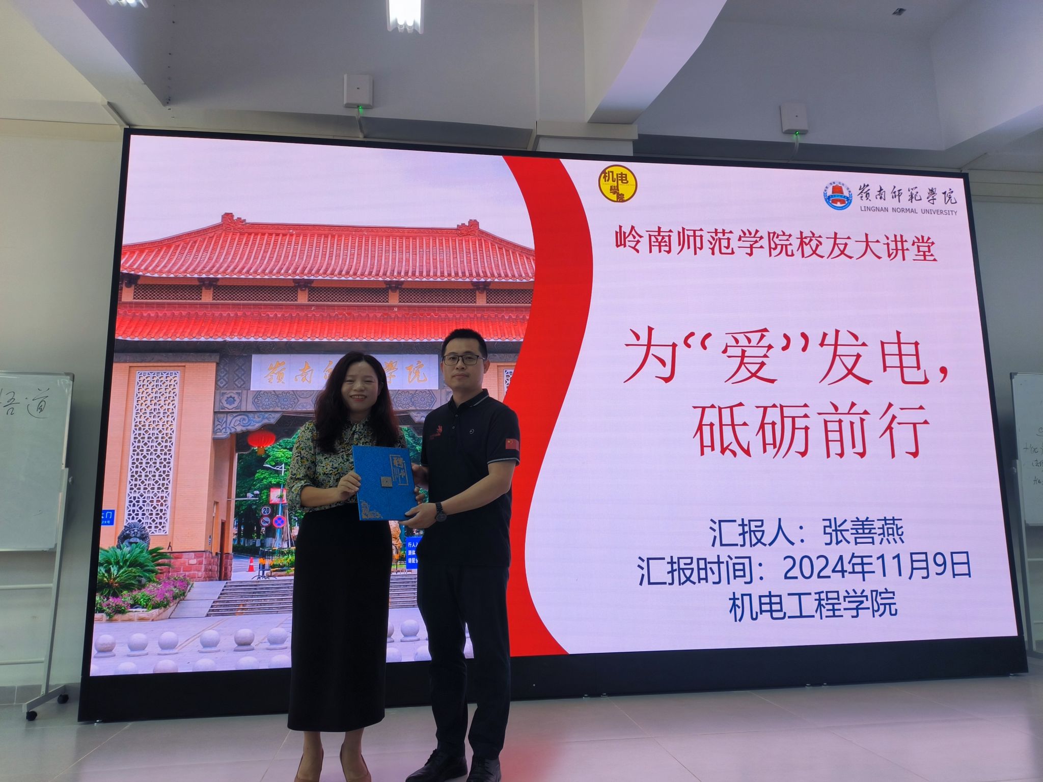 11月9日上午,机电工程学院在湖光校区集贤楼101室举办校友大讲堂活动,活动特邀到第47届世界技能大赛金牌教练、全国技术能手、2007届机电技术教育专业优秀校友张善燕作主题为“为‘爱’发电,砥砺前行”的专题报告。机电工程学院党委副书记黄展、汽车工程系系主任杨振东副教授,机电工程系老师肖水清博士,辅导员林铭增老师以及2024级汽车服务工程、机械电子工程技术和机电技术教育专业的全体学生参加了报告会。