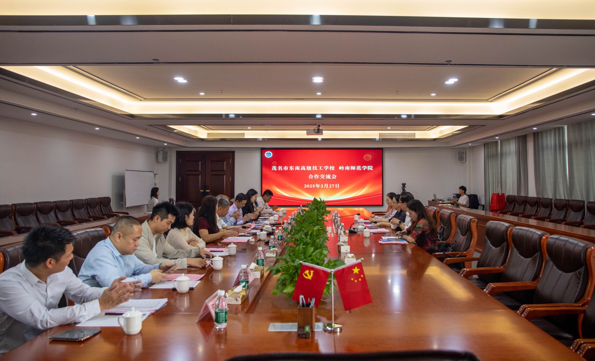 座谈会上,弓满锋一行受到了茂名市东南高级技工学校书记、校长陈勇、常务副校长梁鑫龄、副校长梁进连的热情接待。陈勇致欢迎辞,高度肯定了我校人才培养质量,简要介绍了我校毕业生在该校成长情况,并介绍了该校的办学特色、专业设置及校企合作成果。他强调,技工教育注重实践能力培养,与高校的理论教育具有高度互补性,期待双方在技能人才培养、实习就业基地建设等方面开展深度合作,为双方师生搭建更广阔的成长平台。弓满锋详细介绍了我校和机电工程学院的发展历程、学科建设、师资力量、学术研究以及人才培养等情况。他表示,学院坚持以服务地方经济社会发展为导向,致力于培养高素质应用型工程技术人才,希望以此次交流为契机,进一步深化职普融通、产教融合,实现资源共享、优势互补,共同为区域产业高质量发展提供人才支撑。黄展介绍了学院2025届毕业生就业情况,并就顶岗实习、就业推荐、职业技能培训与认证等进行了进一步说明。