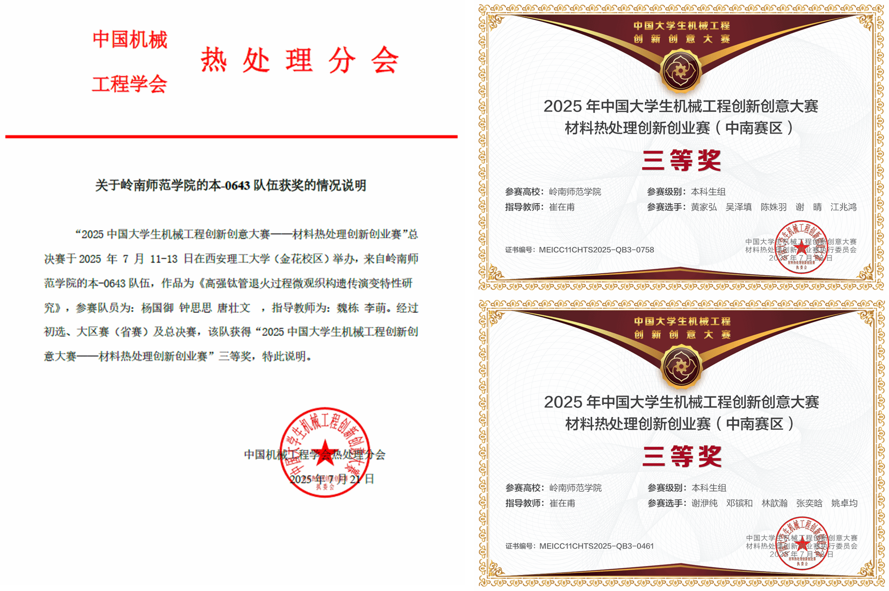 7月中旬,2025年中国大学生机械工程创新创意大赛--第十一届材料热处理创新创业赛总决赛在西安理工大学举行。本届赛事吸引了全国219所高校的2235支队伍参赛,规模创历史新高。为备战此次大赛,机电工程学院积极筹备,扎实推进准备工作,3支报名队伍经过初赛、区域赛、全国总决赛的激烈角逐,最终斩获全国总决赛三等奖1项,中南赛区三等奖2项。