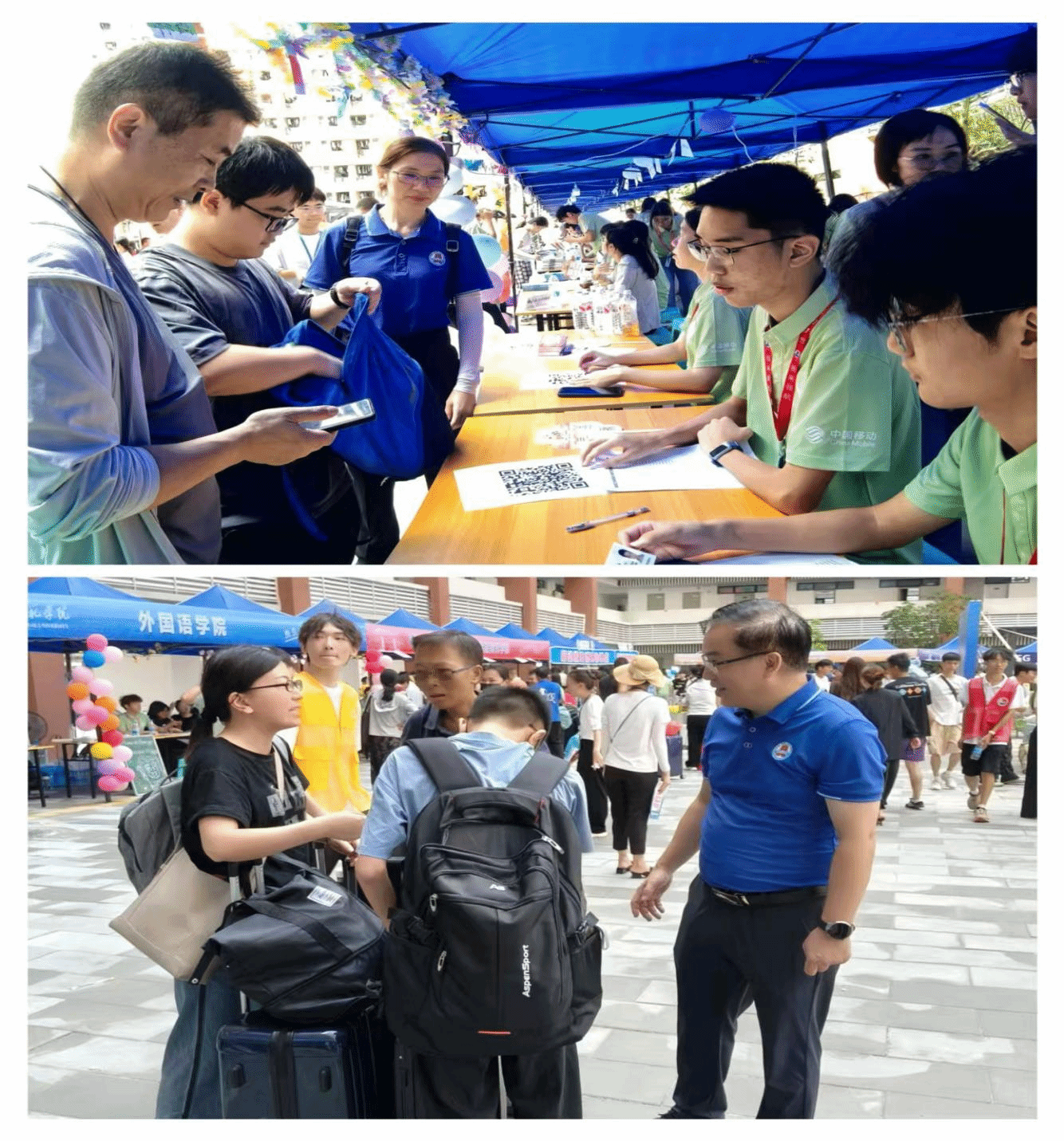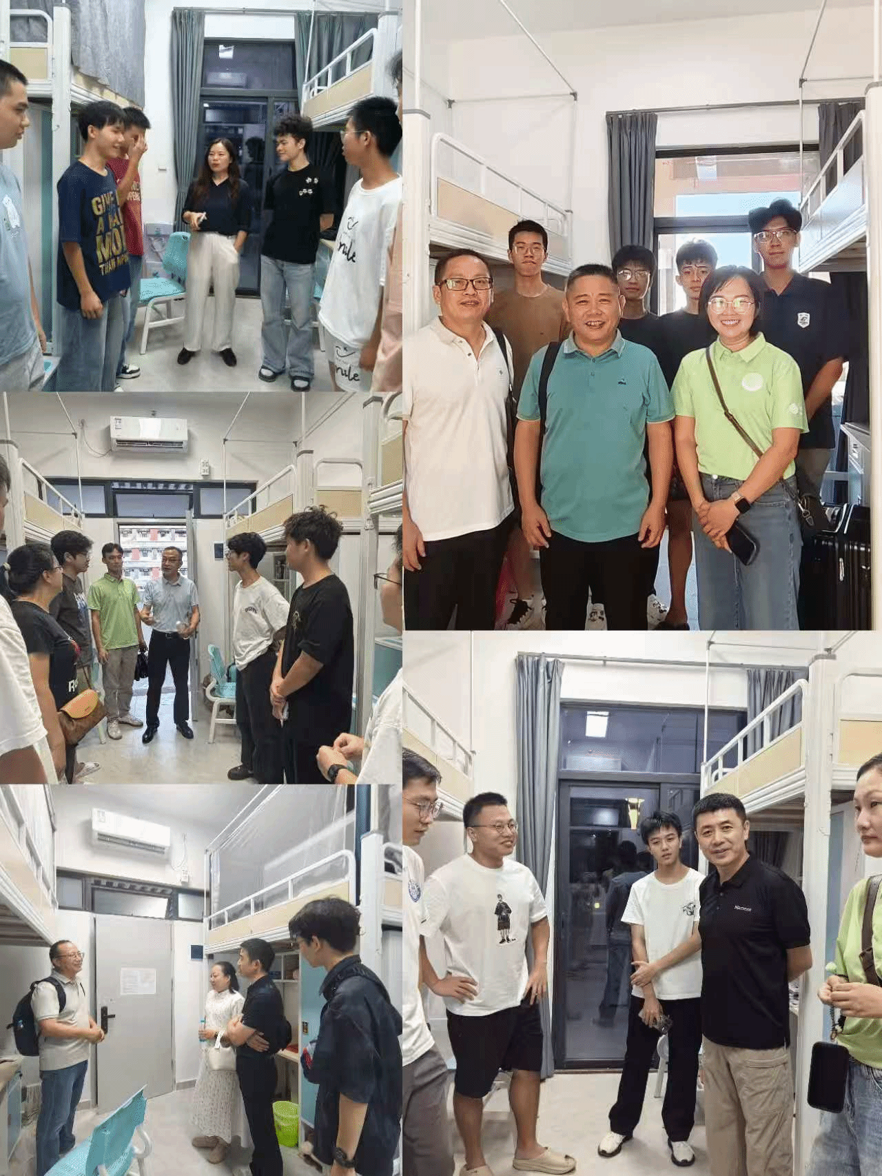 领导深入一线,亲切合影寄语新生。学校领导和学院领导班子深入迎新接待点、宿舍区等,查看报到流程、物资保障、学生入住等情况,与新生及家长亲切交流,耐心解答疑问,并深情勉励新生要珍惜时光、立志成才。