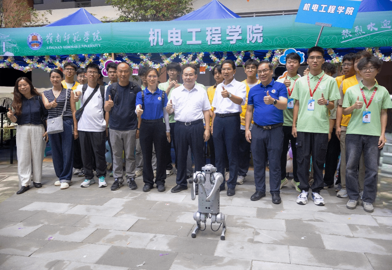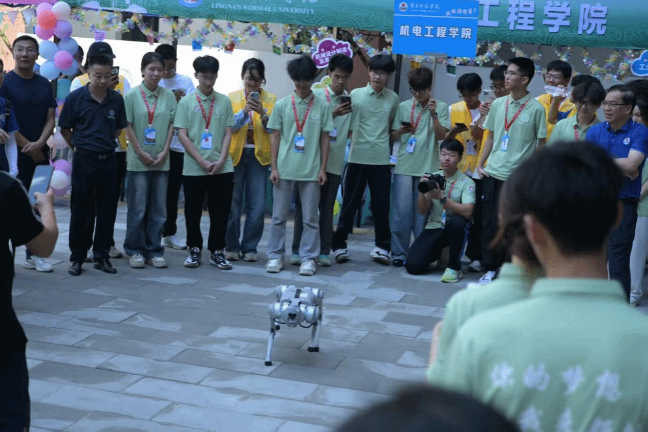 智能科技惊艳亮相,机器狗成迎新“明星”。一经出场,便以科技感十足的外观和灵巧的动作吸引2025级新生驻足围观。随着指令下达,机器狗灵活摇摆、精准急停、作揖问好,一系列行云流水的动作引来阵阵掌声。这场近距离的科技互动,不仅展现出机电学科的魅力,更增强了新生对学院的认同与归属感。