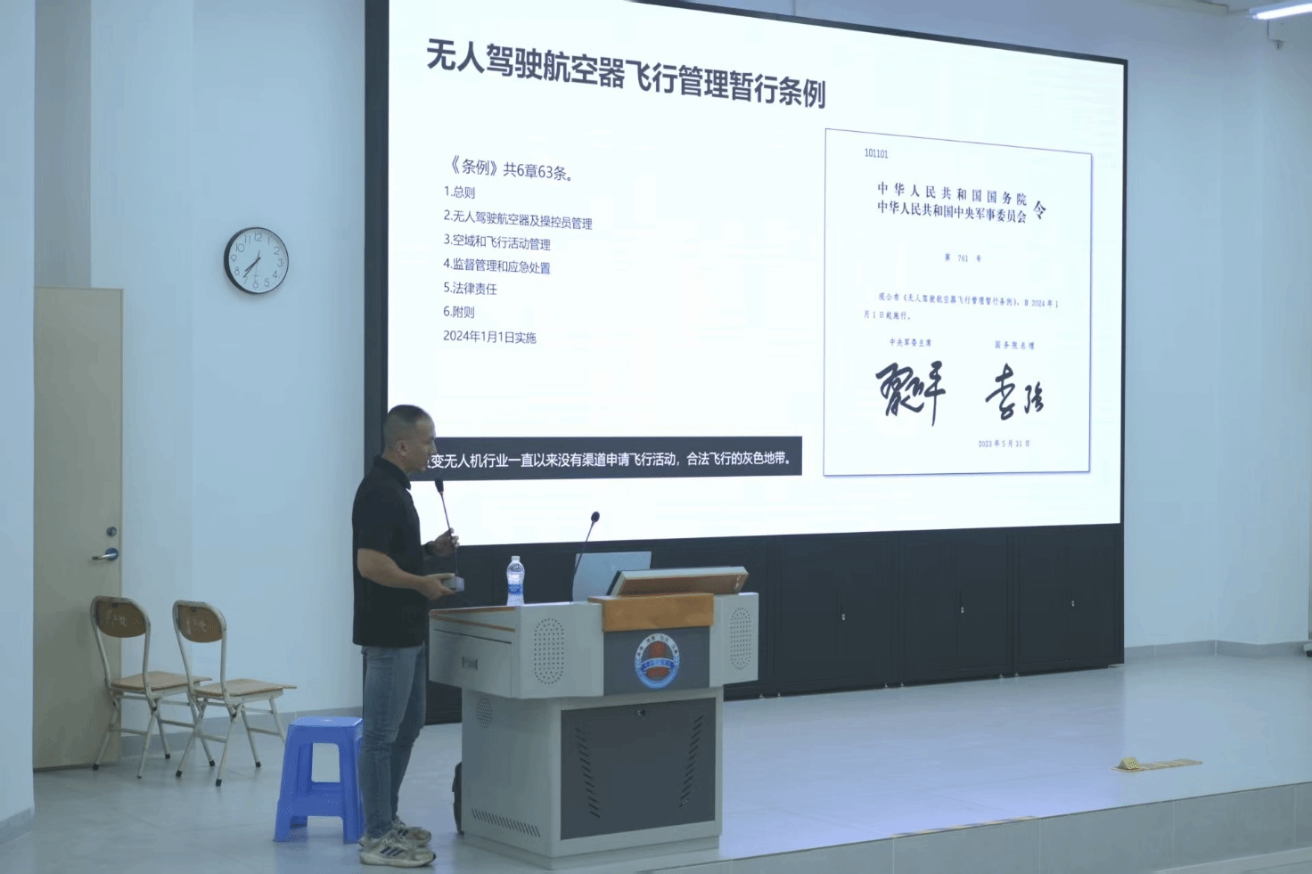 讲座开篇,林栋老师先对相关企业进行介绍,简要说明政府在低空经济以及无人机产业发展方面给予的支持,为后续内容铺垫政策背景。紧接着,深入解读国家政策,围绕安全管理规则以及驾照等级普及等方面展开,使参会同学能更好地把握行业规范与从业的关键要点。