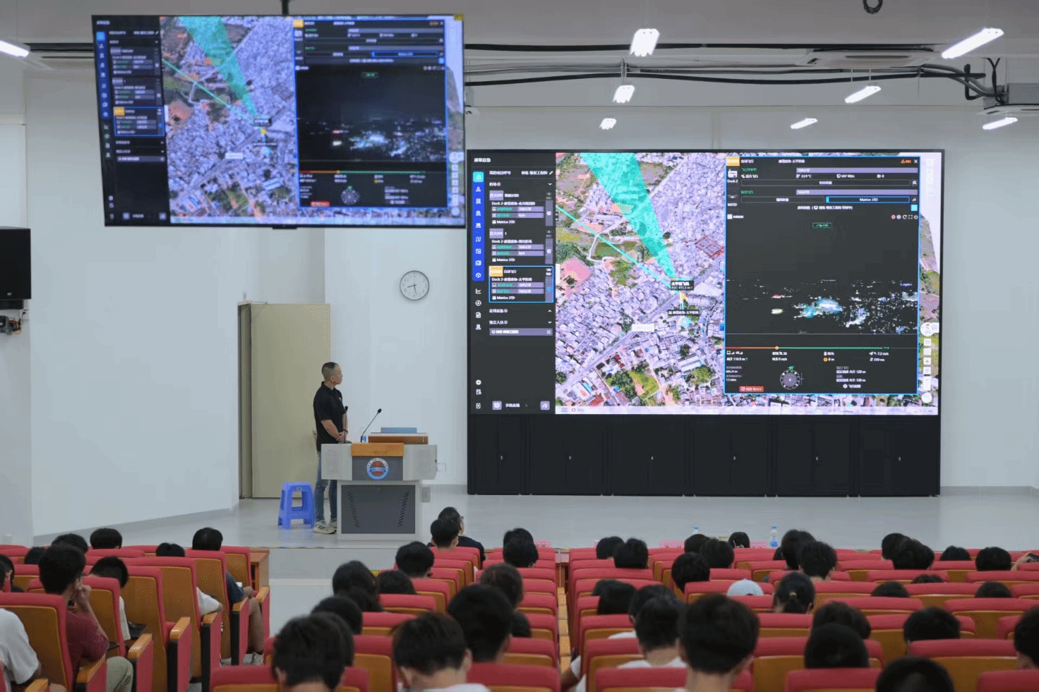 在学生问答互动环节,针对“在平常的工作中为什么不用卫星,而选择用无人机”的问题,林栋老师解答指出无人机相比卫星更具即时性优势,且受天气因素的影响相对较小;此外,林栋老师讲解了学生对“湛江航线”相关的疑问进行了交流探讨,并且现场对民用无人机管理UON平台进行了相关示范及功能介绍。