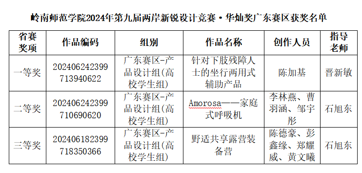 近日,第九届两岸新锐设计竞赛·华灿奖广东赛区获奖名单已公示结束,经组委会专家评审团的严格筛选与审议,机电工程学院学生陈加基、李林燕、曹羽涵、邹宇彤、陈德豪、彭鑫缘、郑耀威、黄文曦等同学的设计作品喜获该赛事广东赛区学生组一等奖、二等奖、三等奖各1项,其中获得省级赛一等奖的《针对下肢残障人士的坐行两用式辅助产品》将继续参加全国总决赛的角逐。