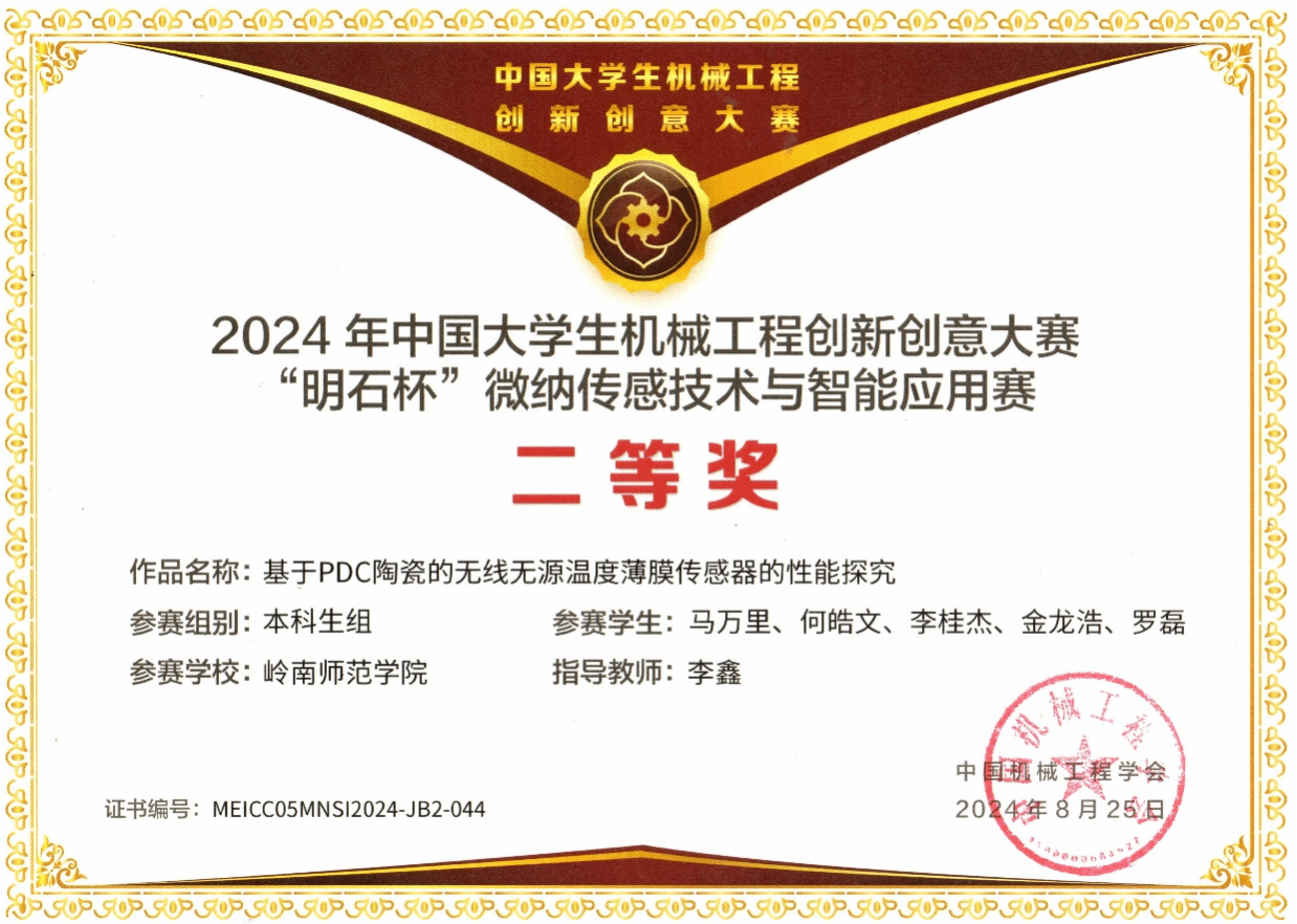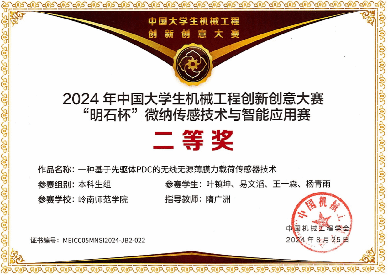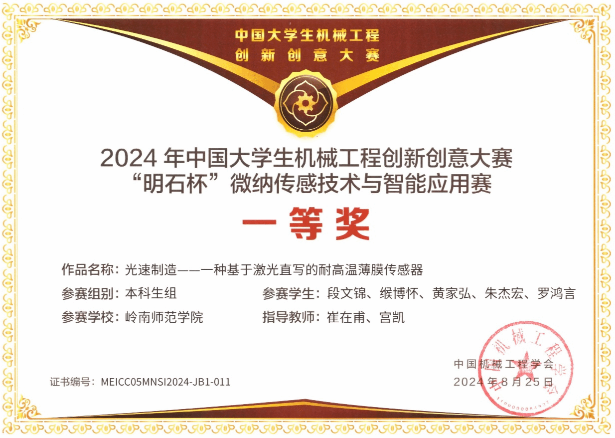 微纳传感技术与智能应用赛是中国大学生机械工程创新创意大赛赛项之一,由中国机械工程学会主办,2019年起纳入《全国普通高校学科竞赛排行榜》竞赛项目。大赛旨在激发大学生对微纳传感技术的兴趣,启迪创新思想,加快传感技术创新步伐,促进传感技术的产业化应用。同时,为微纳传感器产业领域的应用型、复合型、创新型专业人才搭建展示和经验交流平台。2024“明石杯”中国大学生微纳传感技术与智能应用赛主题为“感联世界,智创未来”。自3月启动以来,大赛收到来自全国160所高校参赛队伍的报名,其中309项获得初赛一等奖的作品晋级全国总决赛。最终本科生组12支队伍获得全国一等奖,获奖率仅为2.6%,其中1项即为机电工程学院崔在甫博士、宫凯博士指导的段文锦、缑博怀、黄家弘、朱杰宏和罗鸿言等学生完成的参赛项目《光速制造——一种基于激光直写的耐高温薄膜传感器》。