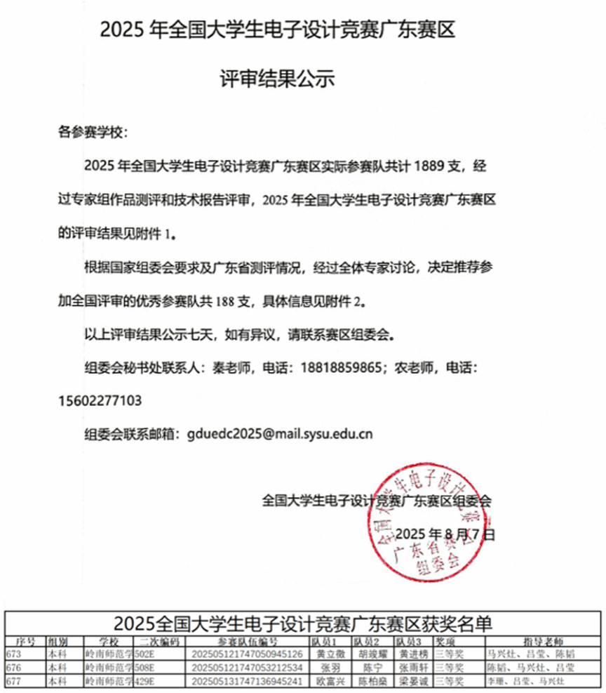 近日,全国大学生电子设计竞赛(2025)广东赛区在中山大学评审结束,比赛圆满落幕。本届赛事吸引了本省90余所高校共计1889支队伍参赛,机电工程学院作为学校参赛主力之一,在指导老师的悉心指导下,精心组织、积极备赛,共派出5支参赛队伍。经过不懈努力,最终3支队伍凭借扎实的技术功底和稳定的现场发挥,荣获省三等奖。