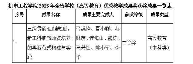 近日,2025年广东省教育教学成果奖(高等教育)评选结果正式公布。我院申报的成果“三级贯通·四链融创:新工科职教师资培养的粤西范式构建与实践”(成果完成人:弓满锋、夏小群、苏财茂、连海山、魏栋、马兴灶、陈小军、李华)荣获高等教育(本科类)二等奖。这是我院首次在省级教学成果奖评选中取得突破,标志着学院在深化教育教学改革、创新人才培养模式方面取得了显著成效,也为我院机械专业学位硕士点的申报奠定了重要基础。