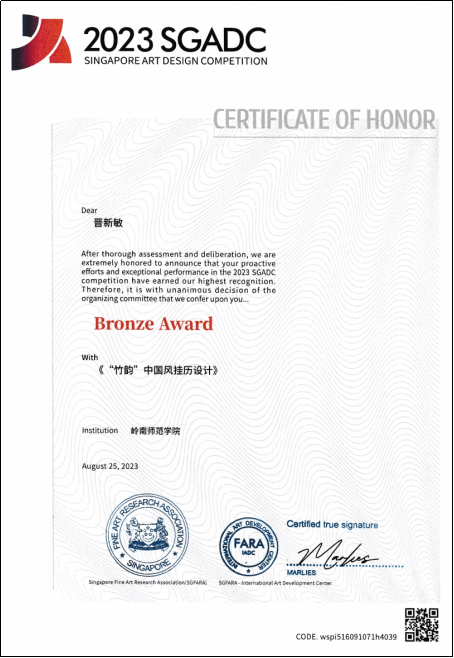 近日,2023SGADC - 新加坡金沙艺术设计大赛圆满结束。我院晋新敏老师的参赛作品《“竹韵”中国风挂历设计》在众多参赛作品中脱颖而出,排名达到前10%,荣获金沙奖铜奖。该产品设计是一款融合传统元素的挂历设计,材料以竹材料为主,极大的保留了竹材的原色,有一种古香古色的味道。每个月份以大小月份进行区别设计,整个产品造型如一把扇子旋转打开,一年过去则竹片360度全部铺满,也寓意圆满,满足了大众的审美需求。