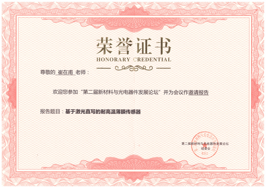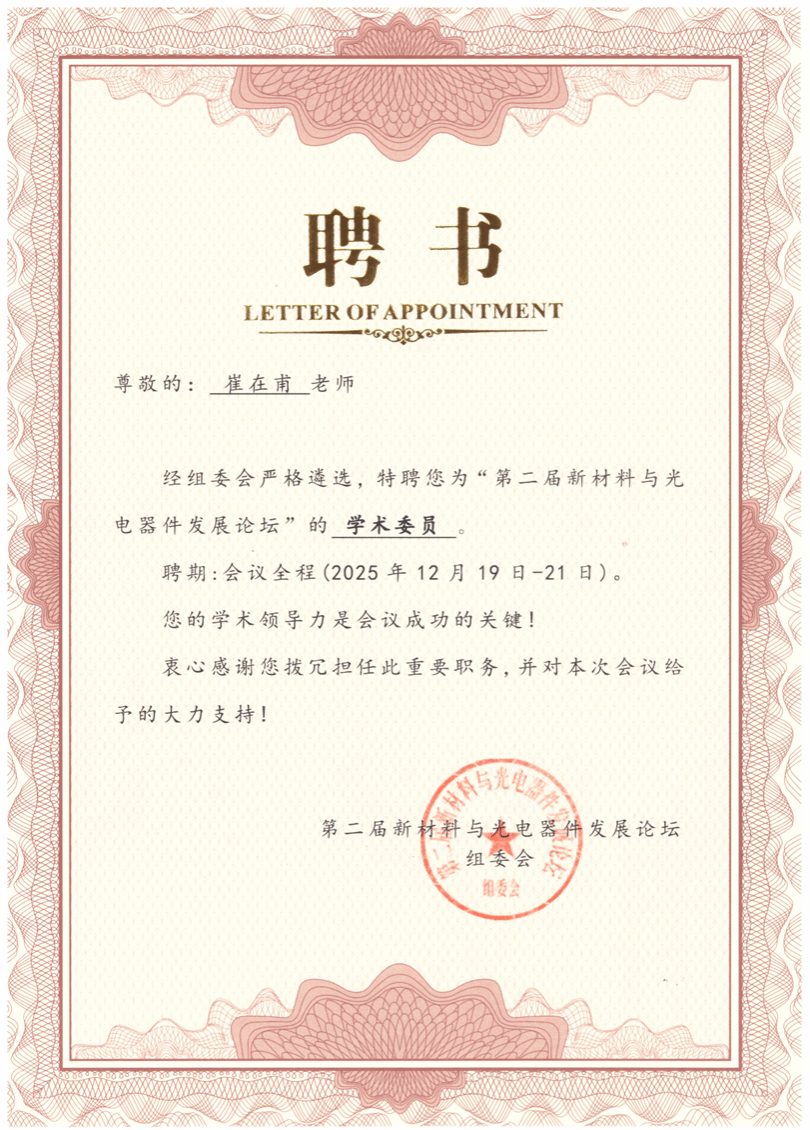 2025第二届新材料及光电器件发展论坛于2025年12月19至21日在云南省昆明市举办,机电工程学院微纳制造与智能传感器科研团队青年教师崔在甫博士在该论坛上获聘学术委员并做邀请报告。报告题目为:基于激光直写的耐高温薄膜传感器。