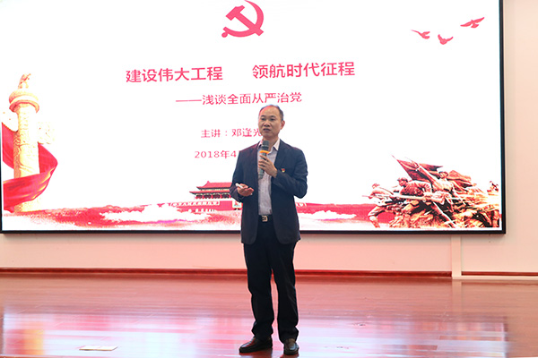 邓逢光为学员作第一讲。他以“建设伟大工程,领航时代征程——浅谈全面从严治党”为主题,从全面从严治党的角度切入,从全面从严治党的时代必然、新时代党的建设目标和要求、全面从严治党,引领新时代新征程、争当中国共产党先锋党员四大方面讲述,带领学员们更加深入地了解党。他提到,从马克思主义政党的本质属性、历史以及面临的严峻形势决定了要全面从严治党。全面从严治党要把党的政治建设摆在首位,用习近平新时代中国特色社会主义思想武装全党,要建设高素质专业化的干部队伍,要加强基层组织建设,要持之以恒正风肃纪,要夺取反腐败斗争压倒性胜利,要健全党和国家监督体系,要全面增强执政本领。在讲述过程中,邓逢光举出大量实例,以生动有趣的讲述方式吸引学员们。作为发展对象与新党员,他希望学员们努力做到讲政治、有信念,讲规矩、有纪律,讲道德、有品行,讲奉献、有作为,在实现中华民族伟大复兴的中国梦的生动实践中贡献自己的力量。