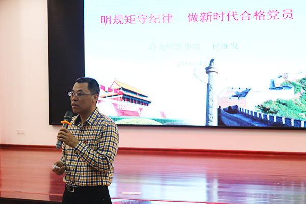 付继发讲授第二专题。他以“明规矩守纪律,做新时代合格党员”为主题,以伏羲女娲图绢画为开端,引出规矩二字,以此说明规矩在生活中的重要性。他认为党员是有着特殊政治使命、受到严格组织约束的人民,入了党就意味着就要在政治上讲忠诚、组织上讲服从、行动上讲纪律,守法且守纪。