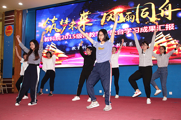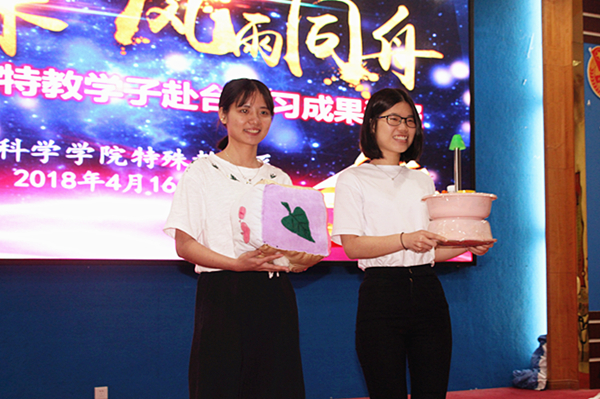 特教系特聘系主任、台湾特教专家吴武典教授发言表示,岭南师院特殊教育专业是在学校政策扶持和校领导关怀下成长起来的,办学六年多,到今年7月份,即将毕业三届共115名学生,绝大部分同学在珠三角一线城市就业,其中有10名同学考上北京师范大学、华东师范大学等国内著名高校硕士研究生。学校办学成绩得到省教育厅及社会肯定,是广东省特殊教育教师发展联盟盟主单位。吴教授告诫同学们要认真学习、敢于创新、强化技能、感恩学校、回报社会,为特殊教育事业贡献自己的力量! 接着,2015级特殊教育专业学生通过PPT展示,从“课堂活动篇”、“实习篇”、“参访篇”和“志愿者篇”等几个方面进行分享,并对即将赴台的2016级师弟师妹们提出许多实用建议,将他们“学而知之,知而用之”的理念传递给特教同学。建议师弟师妹提升自身技能、积极向专业老师提问和学习,积极参与课外学习活动,以获得更多的成长感悟。 除PPT展示之外,2015级特教同学还通过教具模型走秀和现场演示以及小品等形式,展现他们在台湾所学所获,让观众深刻感受到作为一名特殊教育教师对特殊学生学习和成长的重要性和大爱情怀,让更多的人理解和加入特殊教育行业。最后,他们用合唱《我的未来不是梦》表达了他们对特教梦想的追求和对爱的执着,将汇报会推向高潮,现场反响十分热烈 ,特教学子满怀对特教大家庭的归属感和荣誉感。