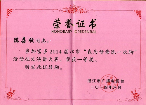 近日,在湛江广播电视台举办的“富多”2014湛江市我为母亲洗一次脚征文演讲颁奖晚会上揭晓了征文和演讲比赛结果,我校教科院的陈嘉欣、揭月琴、张艺三位同学分别荣获演讲比赛的一等奖、三等奖和纪念奖。湛江广播电视台还对荣获一等奖的陈嘉欣同学进行了采访。