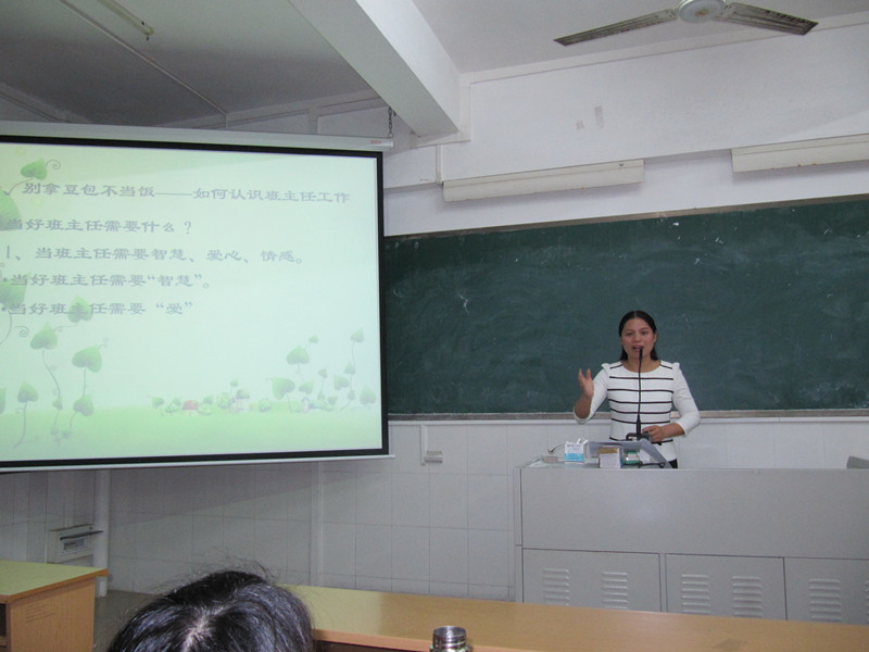 2014年4月2日,湛江八小优秀教师梁桂云谈如何成为一名优秀的班主任(见图五)。可以说梁老师的从教经验对今后我们的教育生涯有很大的推动作用,是促进我们成为一名优秀班主任的催化剂。梁老师以“如何让迈向优秀班主任”为主线,以一线教师案例为依托,以本人丰富的教学经验为基点,向我们传授了如何成为一名优秀班主任的方法与经验。通过本次讲坛,切实提高了作为师范生的我们的教师实践技能和从师意识,推动我们努力迈向优秀班主任的职业道路。俗话说得好“不想当将军的士兵不是好士兵”,而我想说“不想当班主任的教师不是好教师”。但想要当好一名出色的班主任,也绝不是一件简单的事。当好班主任需要什么?需要的是“智慧、爱心、情感”。班主任的素质就是融智慧、爱心、情感为一体,这其中包括组织管理能力 、应变能力、协调能力、观察分析能力、沟通能力以及心理学、教育学知识等。梁老师通过她的实地经验和感悟告诉我们要在学生活动锻炼中提升自己;腹有诗书气自华,要在书本的学习中提升自己;珍惜大学里的见习、实习时间,它是你在从事教师行业前的难得的体验,也是收获教学经验的一次感悟和机会。