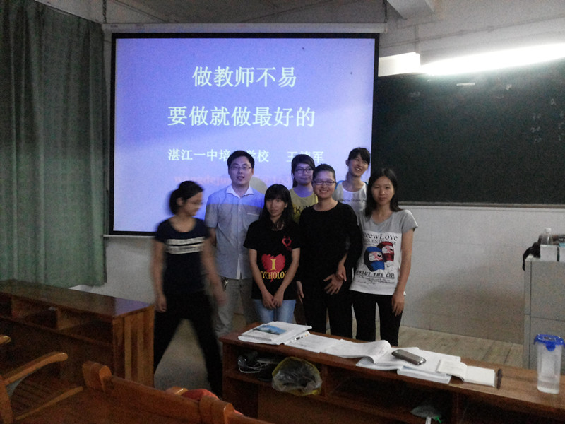 2014年4月14日晚,湛江一中培才学校德育处王德军主任给心理学系的13级和12级全体学生开讲座(图二)。讲座题目是《做教师不容易,要做就做最好的》。王主任看问题的视角比较独特,对心理健康教育的理解也非常独到。本次讲座本来安排在教四612教室,但到会的同学人数众多,讲座临时调到教四605上课。王主任的讲座不负众望,给同学们很大的启迪。最后,在互动环节,同学们的提问非常勇跃,王主任都耐心地一一回答。