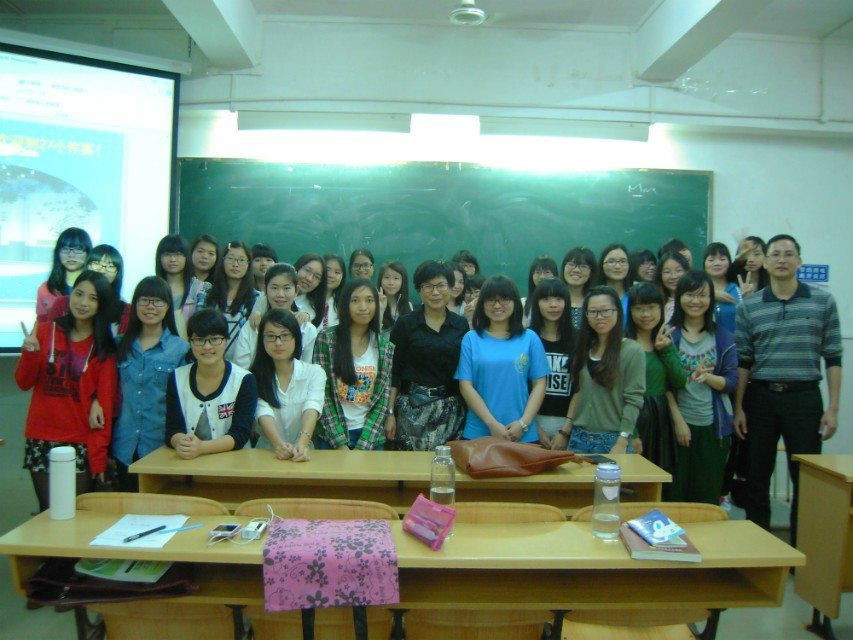 2014年4月9日,湛江市第二十七小学的陈玉娟校长为我们带来了一场别开生面的讲座(图六)。就在讲座一开始时,我们就可以看出陈校长的用心了。精美的课件加上以“爱”为主题的演讲,我们的同学都被吸引住了。而对我来说,最大的收获莫过于是陈校长的独特教育理念了。尽管陈校长从亲情、敬业、坚持等方面来阐述她的教育观点,可她却始终向我们介绍她那“爱的教育”。他举了许多有趣的例子,给我们展示她和学生沟通的技巧。我觉得十分有趣,也十分惊讶。陈校长对教育的热爱和对学生的关爱已经到了一个我们们无法达到的高度了。而面对我们这一群准教师,陈校长就是不断地以自身的经验来感染我们,让我们也在爱的指引下,顺利地走在教师道路上。而讲座快结束时,我一口气问了陈校长两个问题。陈校长的耐心回答给了我极大的启示。对待不同的学生和事件,要用不同的方法,可我们一定要在坚守“爱”的原则下进行。老师投之以桃,学生定报之以李。爱,一直在心中!