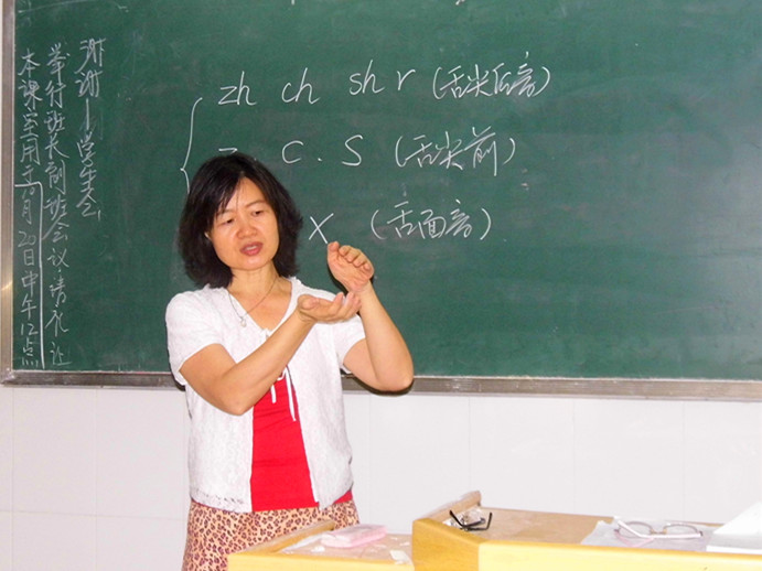 培训课上,林主任全面地介绍了普通话水平测试中单音节字词、多音节词语、朗读短文和命题说话等四个部分的内容,并对普通话教学中的重难点逐一给学员们做示范。在平翘舌、儿化音、舌尖音、韵母、声调、变音等难掌握的地方也特别做出指导。讲到声母的发音难点时,林老师用双手示范发音时舌头的摆动方法,讲述了正确的发音部位。林主任细致的言传身教,让普通话训导员从中受益颇丰。