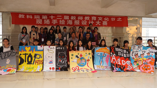 11月28日,在世界艾滋病日前夕,教科院在燕雷楼举办了以“预防艾滋,珍爱生命”为主题的现场手绘海报设计与制作大赛,以充满创意的手绘海报引导大学生提高安全防范意识,关注艾滋病的防治。教科院党委李德深副书记和袁铱琳老师担任了比赛评委,评选出12份获奖作品。获奖作品将在12月1日起在第四教学楼进行展示,向全校宣传“行动起来,向‘零’艾滋迈进”。