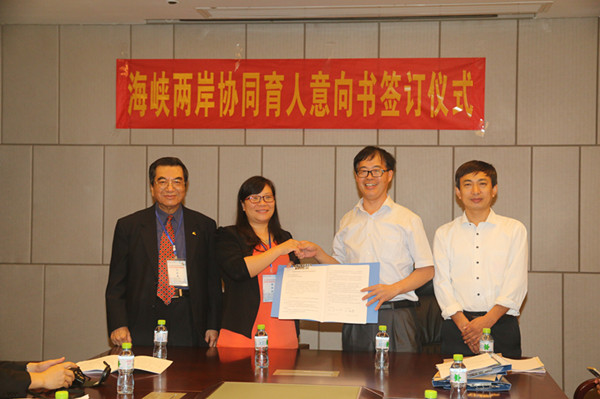 在我校特聘教授、台湾师范大学教育学院前任院长、世界资优教育协会前会长吴武典教授,财团法人科技辅具文教基金会杨国屏董事长等嘉宾的见证下,在我校教科院党委赫云鹏书记的主持下,教科院范兆雄院长与海峡两岸九所特殊教育学校一一签订了《海峡两岸特殊教育协同育人意向书》。台湾宜兰特殊教育学校曾坤祥校长还向八所兄弟学校赠送了纪念品。