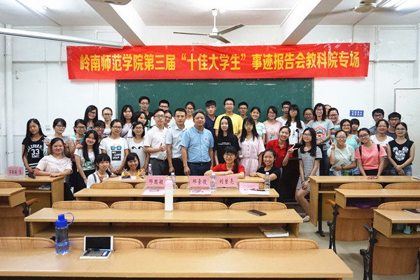 6月15日晚,教科院在燕雷楼412室举办了岭南师范学院第三届“十佳大学生”事迹报告会教科院专场活动。活动邀请了被评为岭南师范学院“十佳大学生”的前校学生会主席邓豪俊同学和自立自强的“特别的贫困生”邓思颖同学做事迹报告。出席本次活动的嘉宾有教科院党委李德深副书记和辅导员刘曾亮老师。