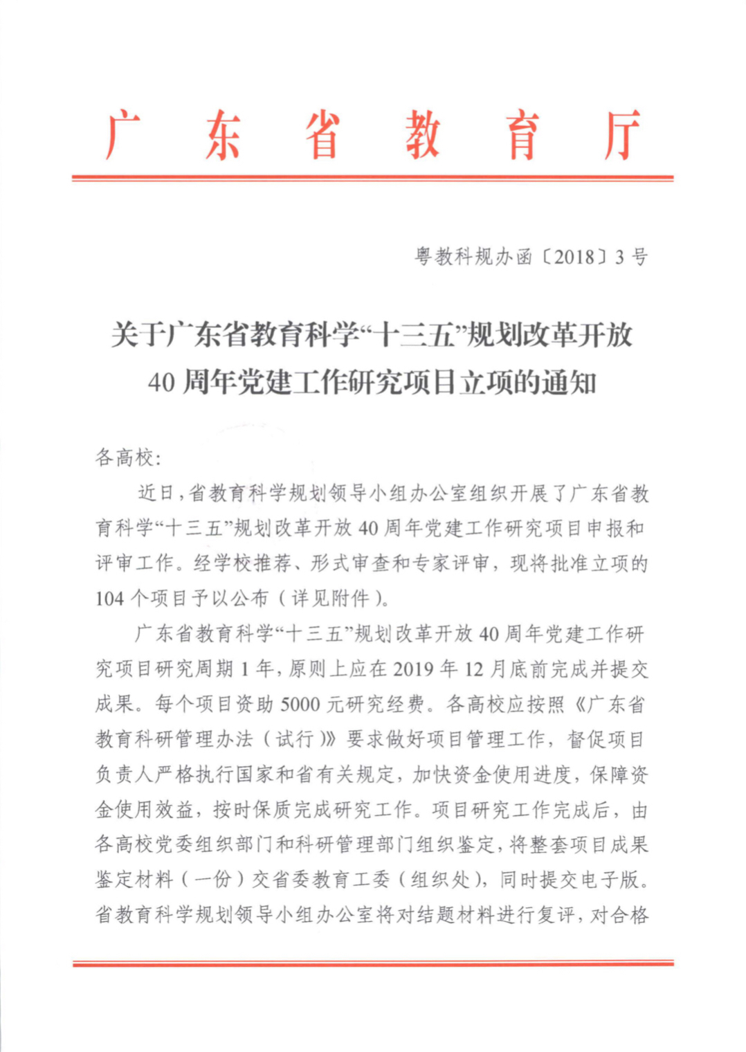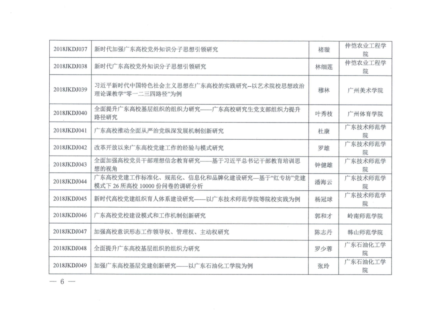 近日,广东省教育科学规划领导小组办公室公布了广东省教育科学“十三五”规划改革开放40周年党建工作研究项目立项的名单。教科院郭和才书记主持的课题《广东高校党校建设模式和工作机制创新研究》获课题立项,也是我校仅有的一项。据了解,此次省教育科学规划领导小组办公室共评出立项课题104项。