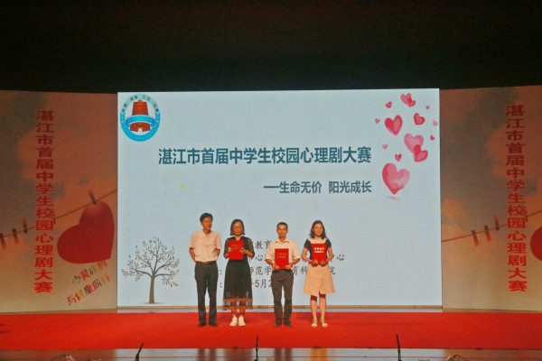 5月23日下午,由湛江市教育局、湛江市心理健康教育指导中心主办,我校教育科学学院协办的湛江市首届中学生校园心理剧大赛于音乐厅举行。湛江市教育局党组成员、副调研员刘绍群,湛江市教育局思想政治教育科科长黄良业、教科院党委书记郭和才及本次大赛评委:湛江市广播电视台总编室副主任、粤西播音主持专业委员会秘书长朱海强、湛江市广播电视台新闻综合频率副总监宋琪、教科院心理学系郑荣双教授、心理学系副主任陈秀芹副教授出席本次大赛。本次比赛以“生命无价、阳光成长”为主题,旨在坚持落实立德树人根本任务,培养学生积极向上的心理素质。