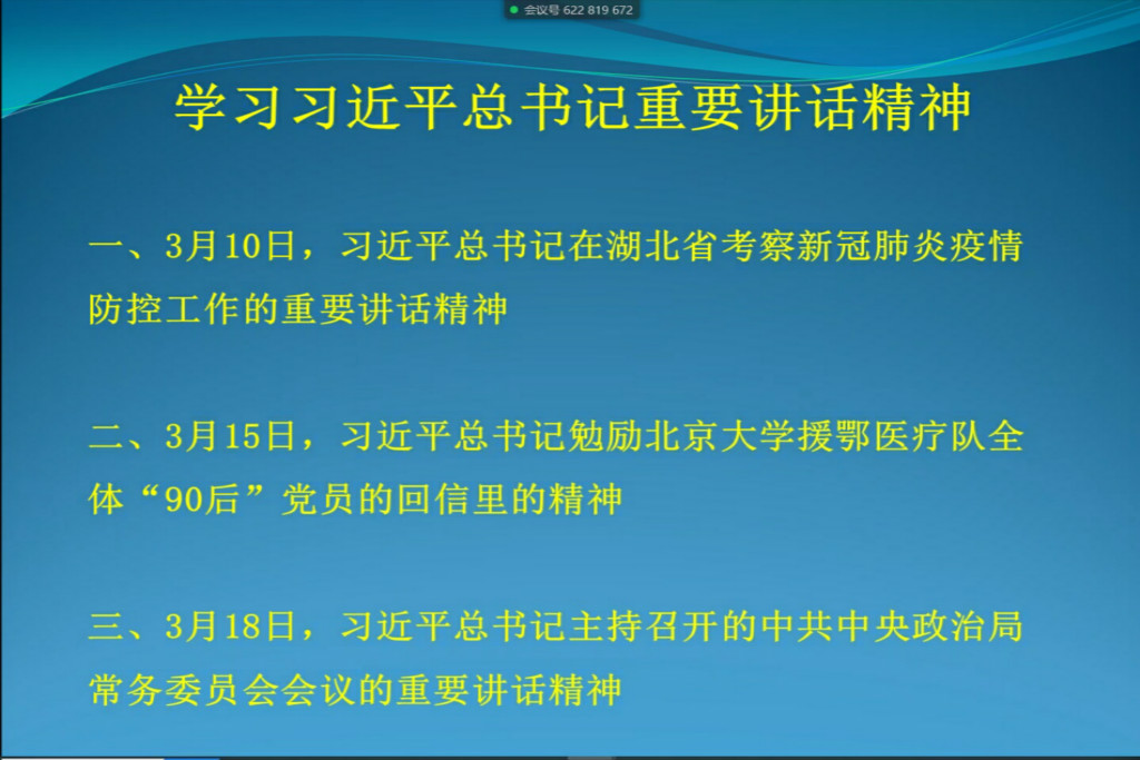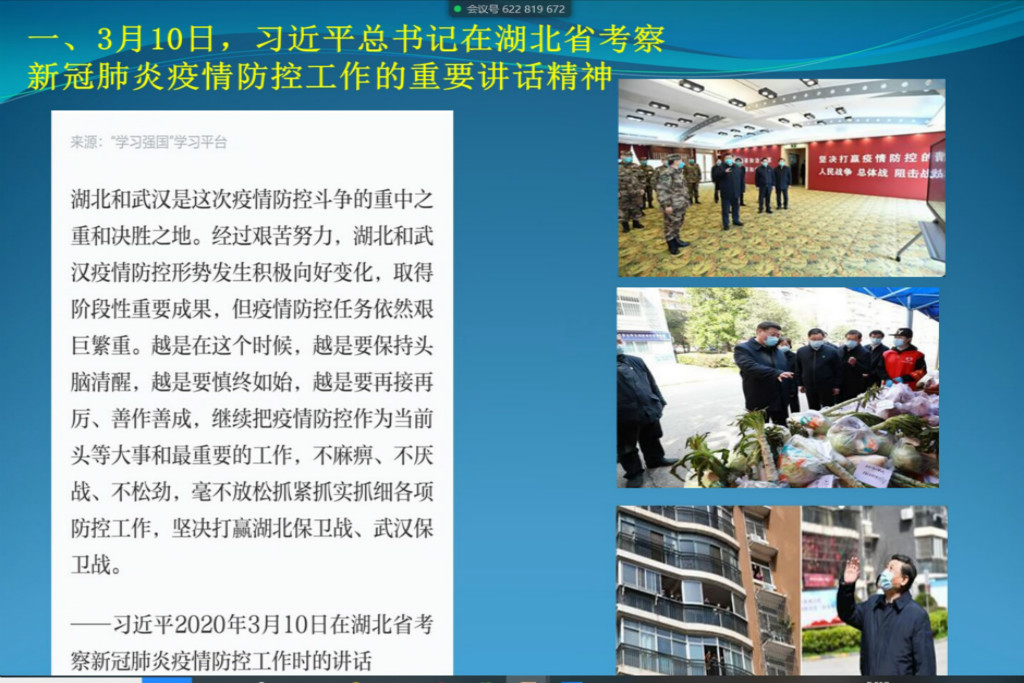随后,团委各部门的部长详细地汇报了近期工作开展情况,就因疫情特殊原因延迟的工作调整方案展开了讨论。各部门积极配合校团委工作,线上组织开展的工作皆已步入正轨。秘书团代表黄田秀围绕习近平总书记在抗“疫”期间的重要讲话精神,展开了研讨学习。她表示青年大学生应当勇担时代责任,努力成为总书记所说的“四有青年”,在为人民服务中茁壮成长、在艰苦奋斗中砥砺意志品质、在实践中增长工作本领。