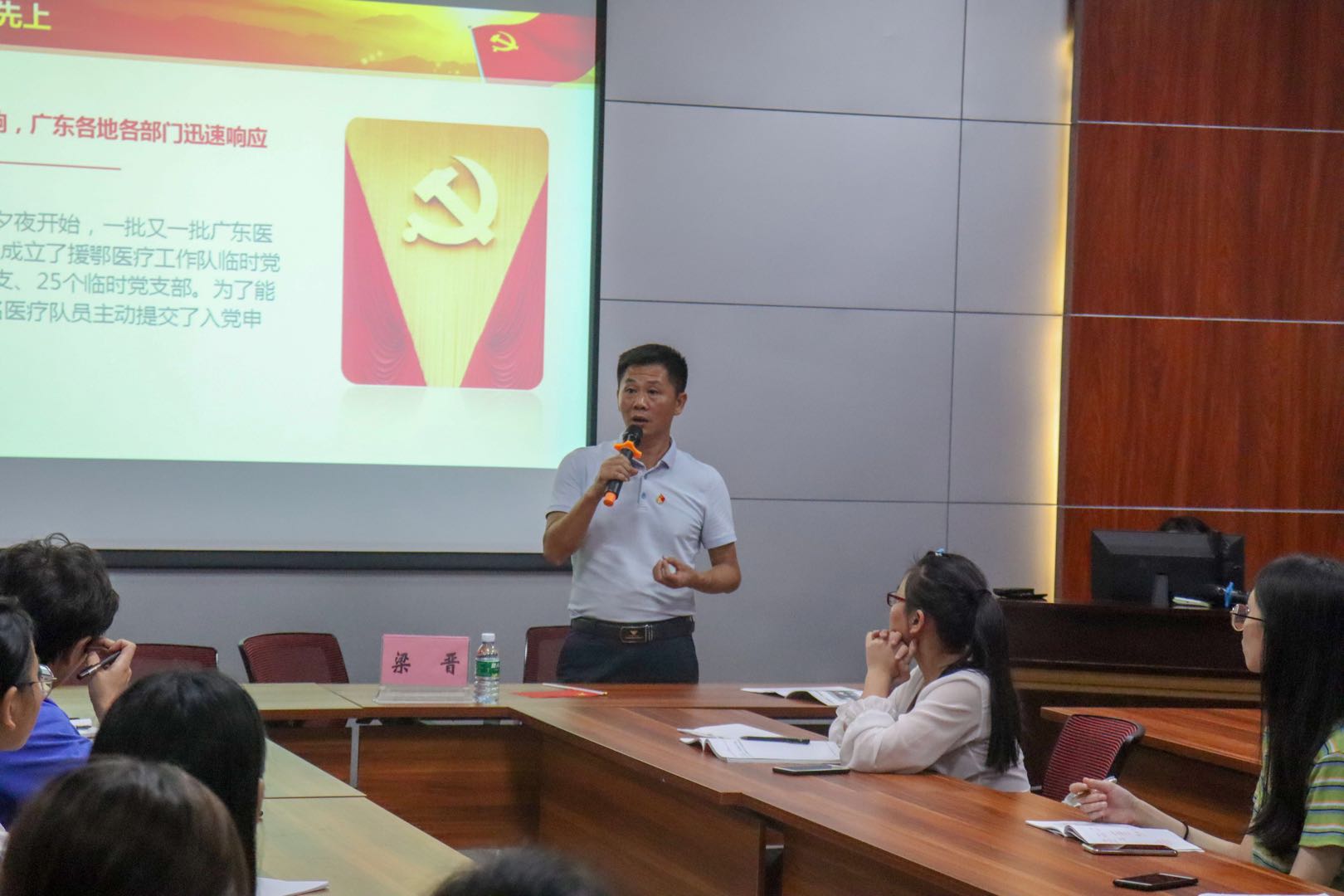 课堂伊始,梁晋结合疫情防控背景,与学生学习领悟《习近平给北京大学援鄂医疗队全体“90后”党员的回信》内容及精神,并举例说明青年党员在疫情中发挥的先锋模范作用。梁晋以疫情期间中共党员的“我是党员,我先上”这句话作为切入点,结合历史对比“给我上”与“我先上”两个词的异同,生动形象地讲解了党员冲锋在前的先锋模范作用。一个党员就是一面旗帜,一个支部就是一座堡垒,梁晋以疫情期间全国各地的党员同志在医护、交通、科研、社区等各个战场上冲在前、干在先,不畏艰险为例,指出在困难面前青年党员应勇于站出来,发挥共产党员的先锋模范作用和带头作用。