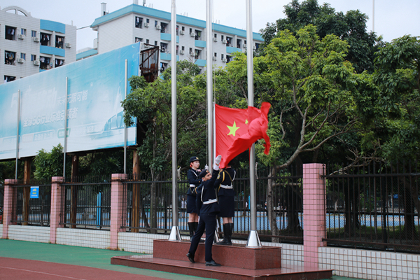 升旗仪式于7点05分准时开始。在全体师生的注目下,英姿飒爽的国旗护卫队精神抖擞地踏着正步,护送鲜艳的五星红旗进场,点燃了在场师生满腔炽热的爱国之情。行礼完毕,伴随着庄严嘹亮的国歌声,五星红旗冉冉升起,全体师生凝视着迎风飘扬的五星红旗,表达了对祖国无限的热爱和崇高的敬意。