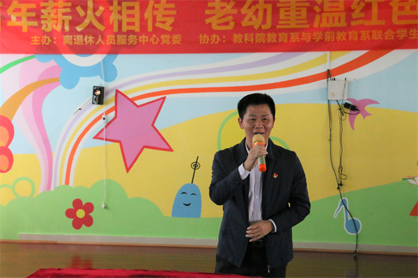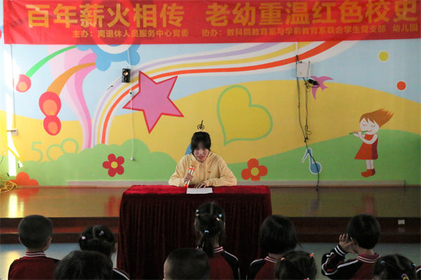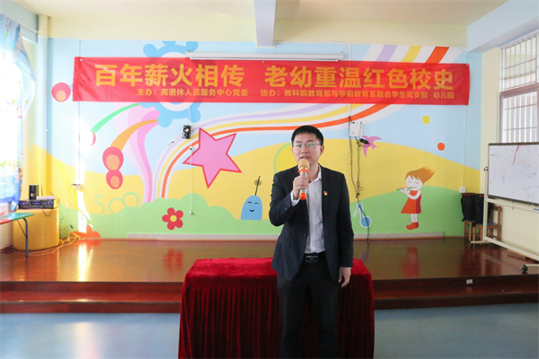 11月11日上午,离退休人员服务中心党委、教科院教育系与学前教育系联合学生党支部、后勤部第四党支部于岭师附属幼儿园6楼开展“百年薪火相传,老幼重温红色校史”活动。离退办服务中心党委书记、主任欧海清、教科院党委书记梁晋、后勤第四党支部书记李晓红、离退办服务中心副主任叶德波、教科院辅导员李水清、岭师附属幼儿园全体党员老师、教科院学生党员、发展对象、入党积极分子和幼儿园小朋友代表出席本次活动。活动由李晓红主持。