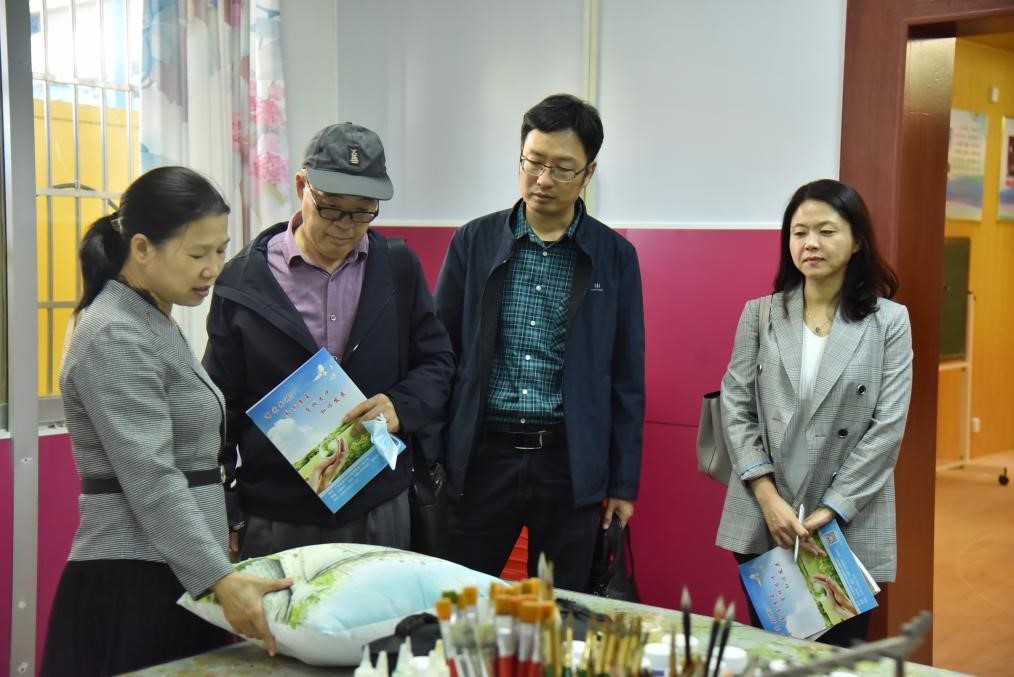 在蓝华坤副校长、李祥基副校长、叶郁林副校长和黄耀鹏主任的带领下,教科院范兆雄院长、李继波副院长、特殊教育系杨溢主任、学前教育系徐宝良主任、茂南区特殊教育学校教师代表及实习教师一同参观了茂名市特殊教育学校的书法室、国画室、穿珠室、手工制作室、烹饪室。范兆雄院长一行对学生们苍劲有力的毛笔字、惟妙惟肖的国画作品和漂亮的特色穿珠赞叹不已,他指出茂名特校培养学生一技之长的工作方向是极为准确的。随后在学校的文化长廊中,蓝华坤副校长详细介绍了茂名特校作为“全国特殊艺术人才培养基地”历年来获得的艺术成就。