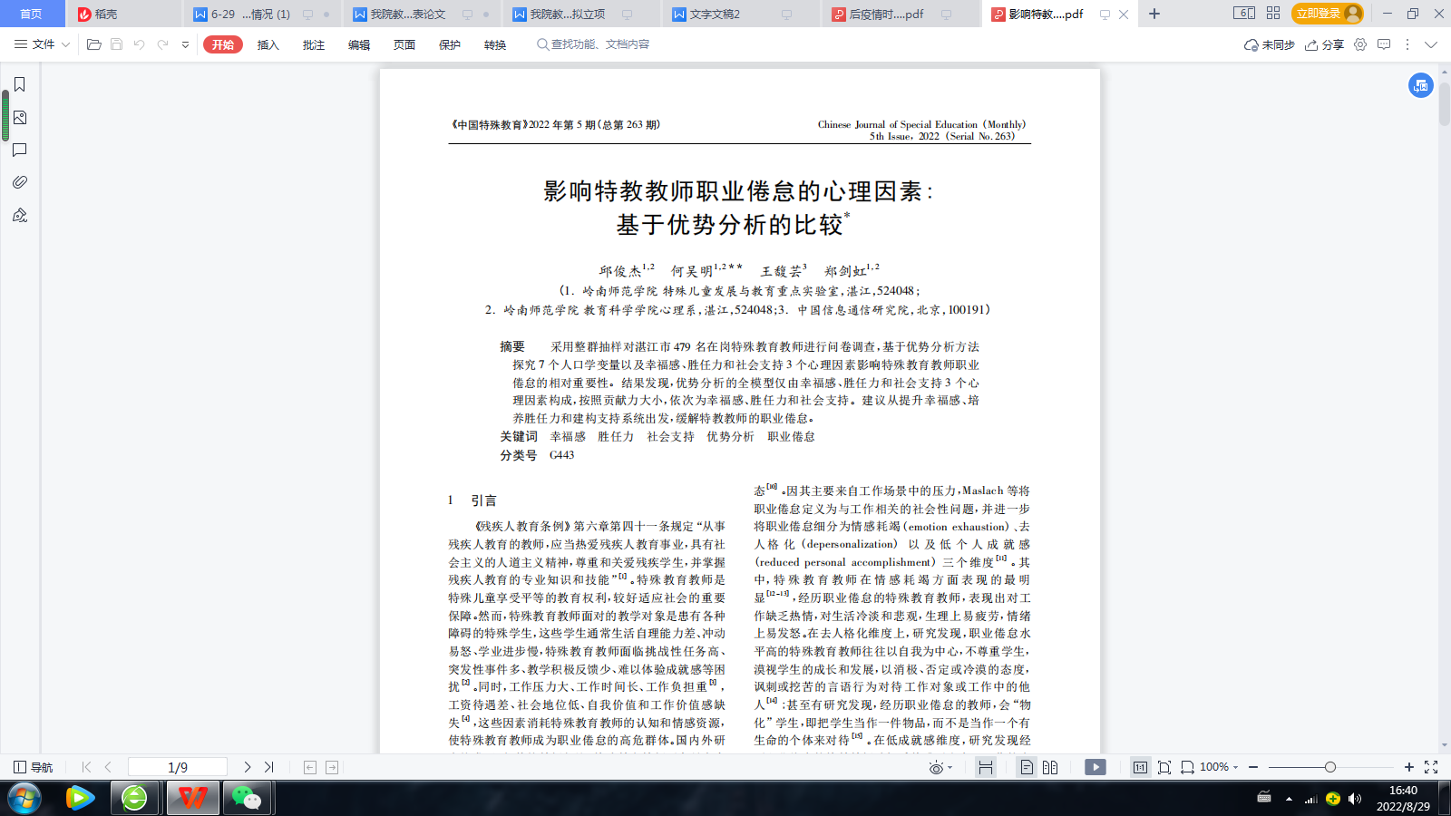 我院心理系邱俊杰博士、何吴明博士等撰写的论文《影响特教教师职业倦怠的心理因素: 基于优势分析的比较》发表于特殊教育专业期刊《中国特殊教育》(2022年第5期)。作者采用整群抽样对湛江市 479 名在岗特殊教育教师进行问卷调查,基于优势分析方法探究 7 个人口学变量以及幸福感、胜任力和社会支持 3 个心理因素影响特殊教育教师职业倦怠的相对重要性。结果发现,优势分析的全模型仅由幸福感、胜任力和社会支持 3 个心理因素构成,按照贡献力大小,依次为幸福感、胜任力和社会支持。建议从提升幸福感、培养胜任力和建构支持系统出发,缓解特教教师的职业倦怠。