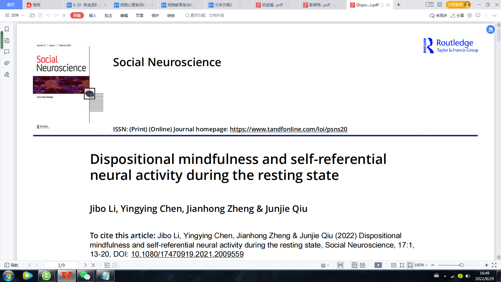 我院心理系李继波副教授撰写的论文《Dispositional mindfulness and self-referential neural activity during the resting state》发表于SCI收录期刊《Social Neuroscience》(2022年第1期)。作者首次探究未受过正念训练的个体特质正念水平差异的神经基础。探讨静息状态下的低频波动振幅(ALFF)与特质正念的关系。结果表明,特质正念与左侧前运动皮层自发激活呈负相关;特质正念水平较高的个体需要较少努力去控制无关的自我参照运动反应。