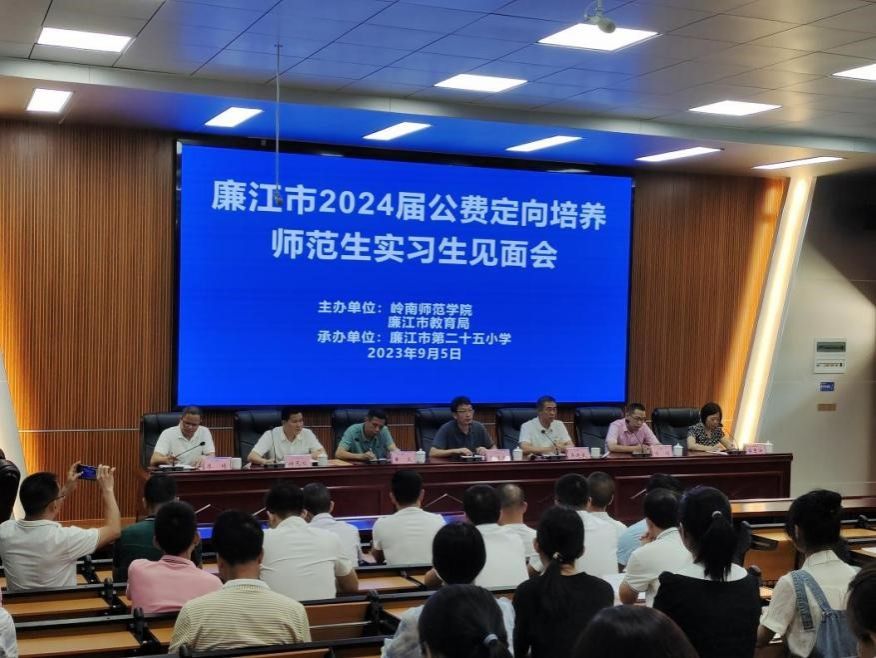 为了顺利推进公费定向师范生教育实习工作,教科院李继波副院长、教育系闫闯主任、梁碧湘老师于9月5日上午9点,与廉江市委教育工委书记、教育局长吴延武、教育局党组成员黄炎、教育局人事股股长钟天欢、各个实习对接单位分管领导,以及100名公费定向实习生,在廉江市第二十五小学一楼学术报告厅开展了教育实习见面会。