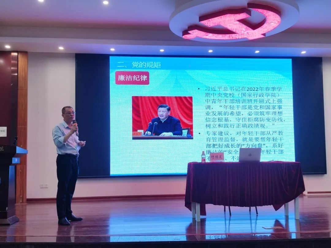 付继发为新党员作了党规党纪教育专题讲座。讲座借古喻今,由浅入深地讲述了“不以规矩,不能成方圆”,着重提出规矩做事,踏实做人是加入中国共产党组织的必要前提,提出大学生党员必须遵守党的规矩,并从四个方面围绕“党的规矩”展开详细介绍,他勉励学生党员做一个遵规守纪的新时代合格大学生党员,深刻定位自己的身份,坚定自己的理想信念,补精神之“钙”、固思想之元,让规矩和制度入心入脑。