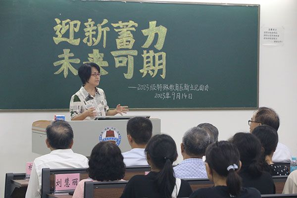 郑荣双老师为大家介绍特殊教育系的概况。她强调,该专业以特殊儿童评估、自闭症、智障、学习障碍、资优教育为主要研究方向,着眼于社会需要,以开展应用型、服务型研究为主。她表示,特教系在特殊儿童评估量表研制、自闭症的沙盘治疗等领域已经取得了初步进展。她还表示,未来将在特殊教育师资培养、在职教师培训、特殊儿童心理研究、特殊儿童评估与康复等方向上,努力探索,促使特殊教育学科发展取得更大进步。杞昭安老师用图文并茂的PPT向同学们介绍特教专业的基本情况和发展成效。刘慧丽老师对同学们寄予殷切的嘱托,希望大家能够带着美好的憧憬和理想,迎接光辉灿烂的明天。随后,20级特教1班蓝清慧师姐进行经验分享,新生代表23特教1班何荞珊、23特教2班李一男先后进行精彩的发言。