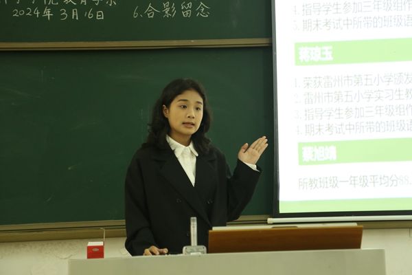 会议进入第三项流程,四组实习小组代表依次上台进行发言,汇报实习工作完成情况,大致分为教育教学工作,班主任工作,教研活动,以及实习总结与反思四个板块进行详细地发言。其中,雷州实习小组的同学们深刻体会到作为教师应尊重学生的个性选择和发展需求,同时注重感性认识的积累以及积极的反思与学习;而廉江实习小组的代表则引用了一句名言“学为人师,行为世范”,以此作为他们不断前行的座右铭。