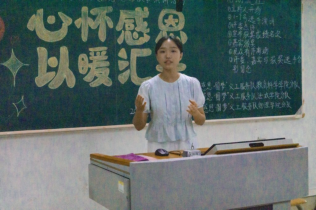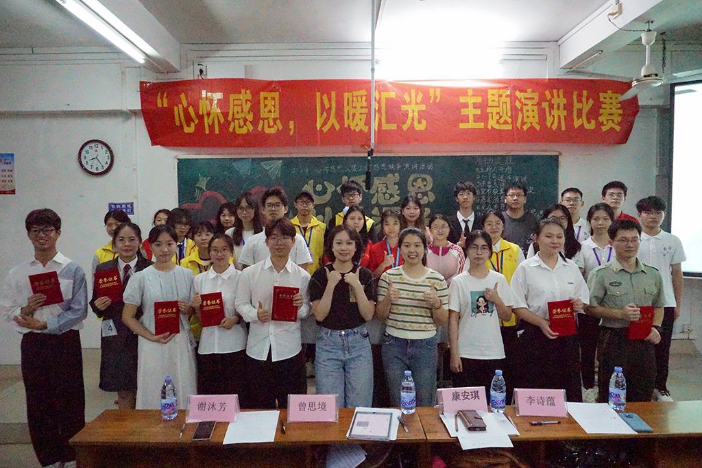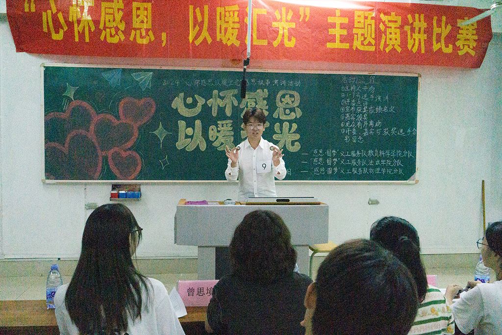 为了弘扬感恩精神,引导学生学会感恩,珍惜身边的每一份关爱,“感恩·圆梦”义工服务队教育科学学院、法政学院、物理学院分队于2024年5月19日在第三教学楼联合举办了以“心怀感恩,以暖汇光”为主题的演讲比赛。辅导员曾思境老师、康安琪老师、校勤工干部李诗蕴、法政院勤工谢沐芳副主任、教科院勤工副主任黄睿和物理院勤工副主任叶亲通出席本次比赛。