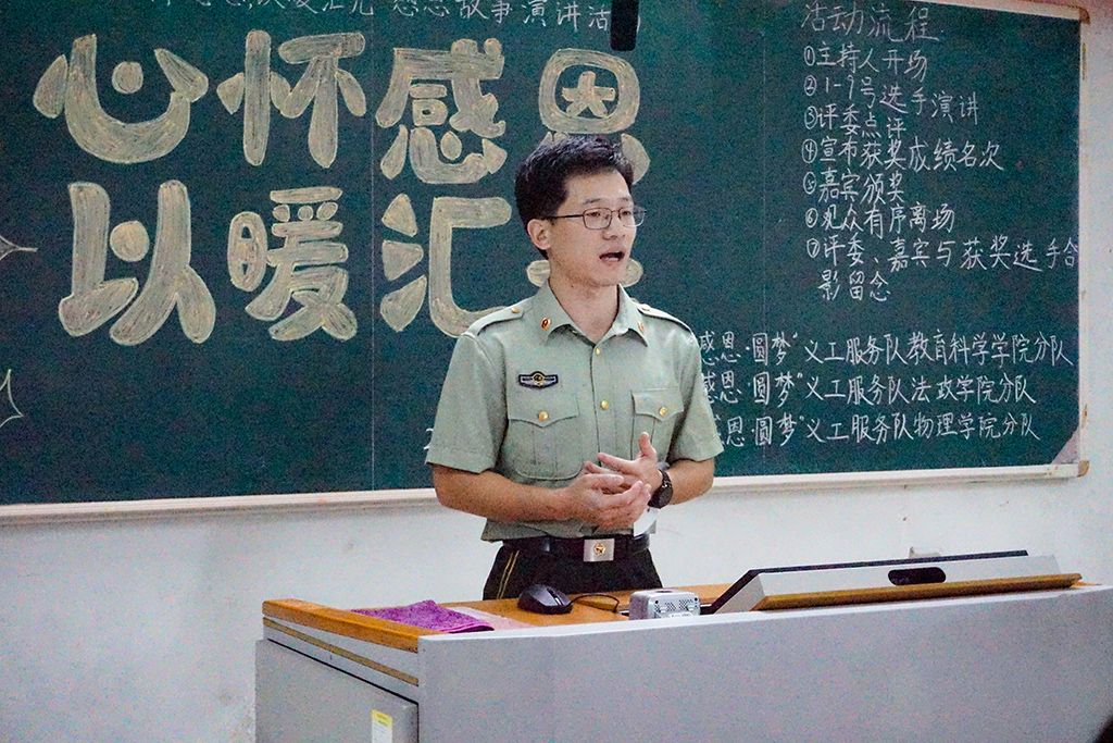 其中,来自法政学院21历史4班的雷子燃同学作为退伍军人,分享了他两年的军旅生活,他提到训练虽然辛苦,但是跟其他处在战乱的国家相比已经好上太多太多,我们有幸生于华夏,就要珍惜当下的和平,世上哪有岁月静好,只是有人替我们负重前行。他表示我们要感恩边防战士的英勇付出,感恩祖国的伟大繁荣,心怀感恩,见证华夏荣光。另外,来自物理学院23物本2班的王嘉诚以一个磁铁实验为开头,讲述了他与家人之间的故事,分享亲人之间的点滴,和谐的家庭关系有助于他日后茁壮成长,他表示家人的爱是自己成长路上最坚实的后盾,也是他心中最温暖的光。