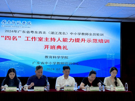 7月15日上午,2024年度广东省粤东西北(湛江茂名)中小学教师全员轮训——“四名”工作室主持人能力提升示范培训班,在岭南师范学院开班。来自湛江市和茂名市的50位“四名”工作室主持人齐聚湛江市,拉开了为期7天的集中研修之旅。