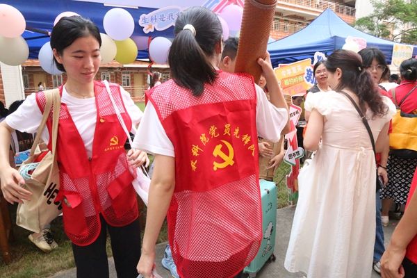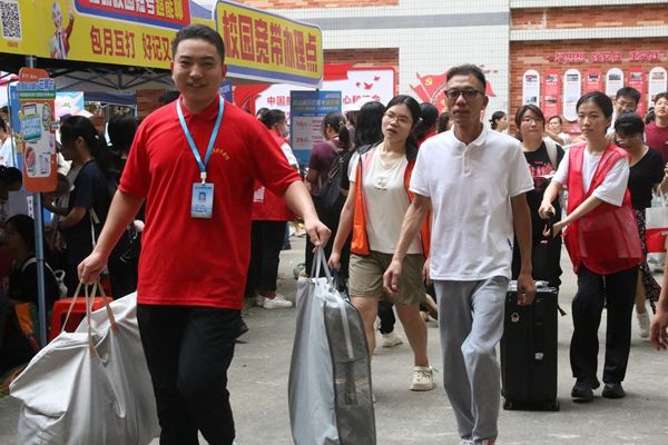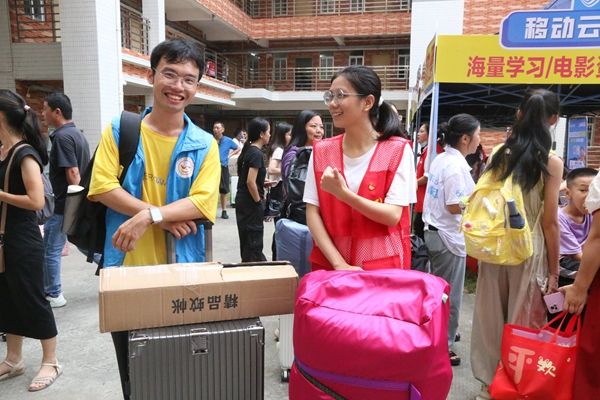 志愿者帮助新生搬运行李(谢楚怡摄)